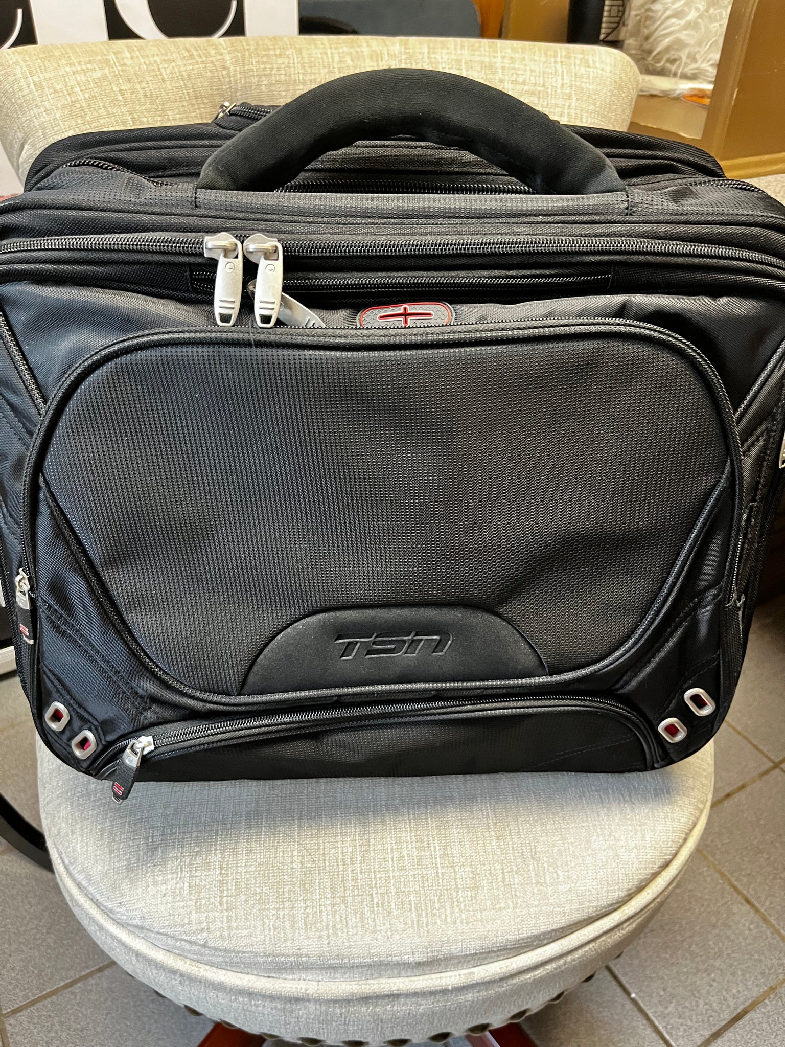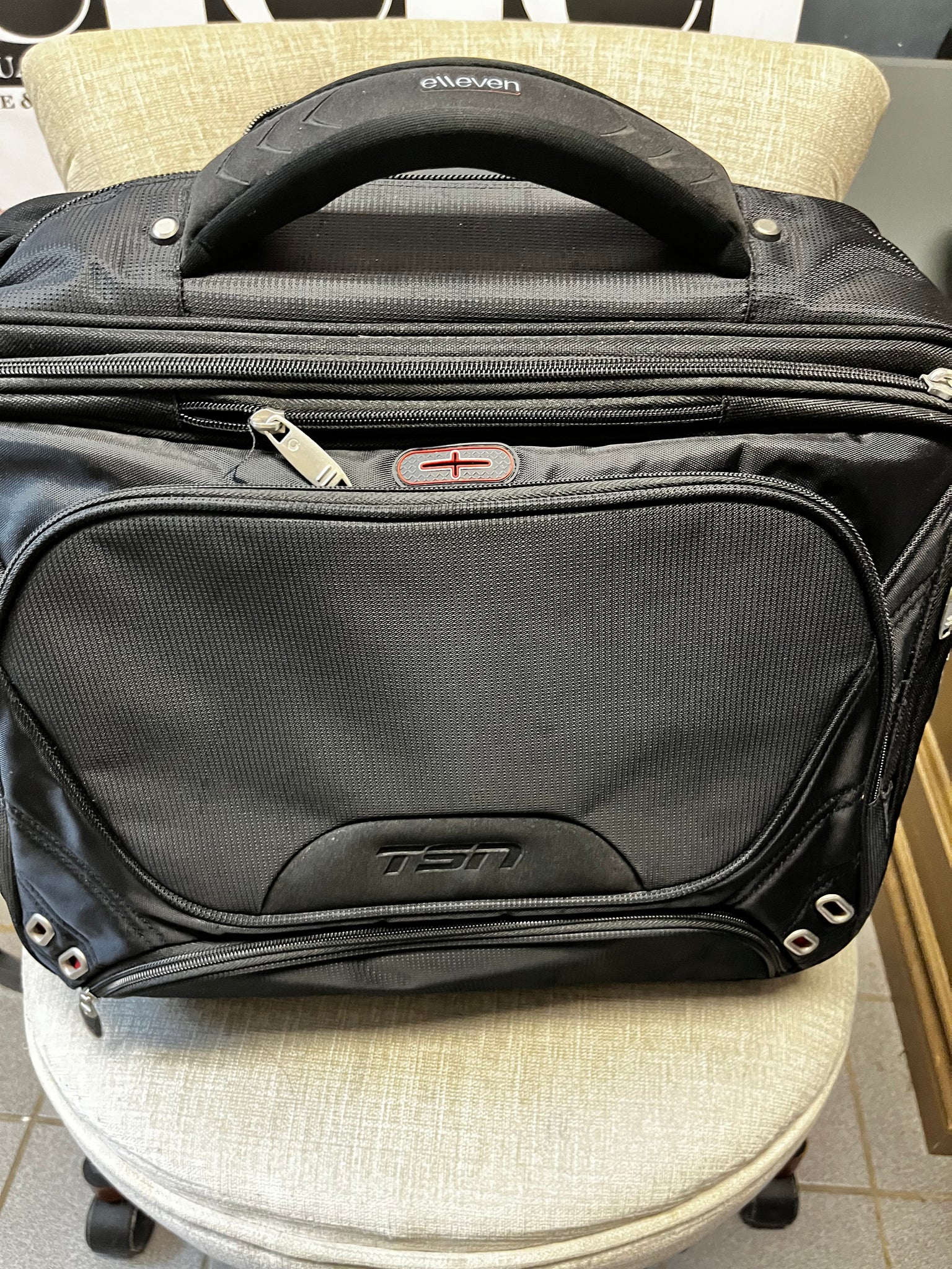 Introducing our TSN Branded Wheeled Carry-On Suitcase NWOT, perfect for luxurious travel. With an elegant shoulder strap and plenty of storage compartments, this suitcase is both practical and stylish. The extendable handle and wheels make it easy to navigate through any destination, while the Eleven brand and TSN logo add a touch of exclusivity. Travel in style with this premium suitcase. Measures 17"w x 15"t x 8" thick.