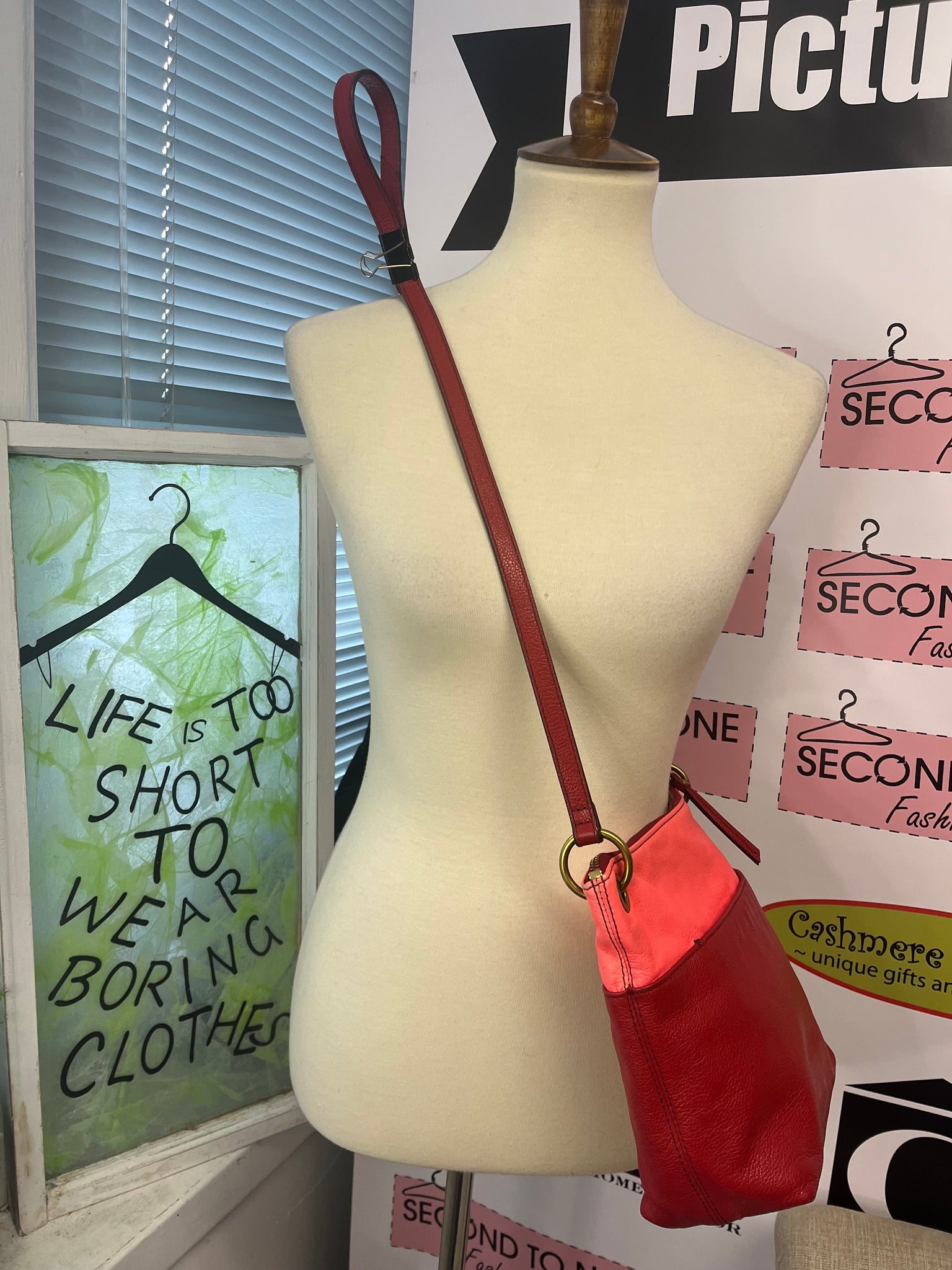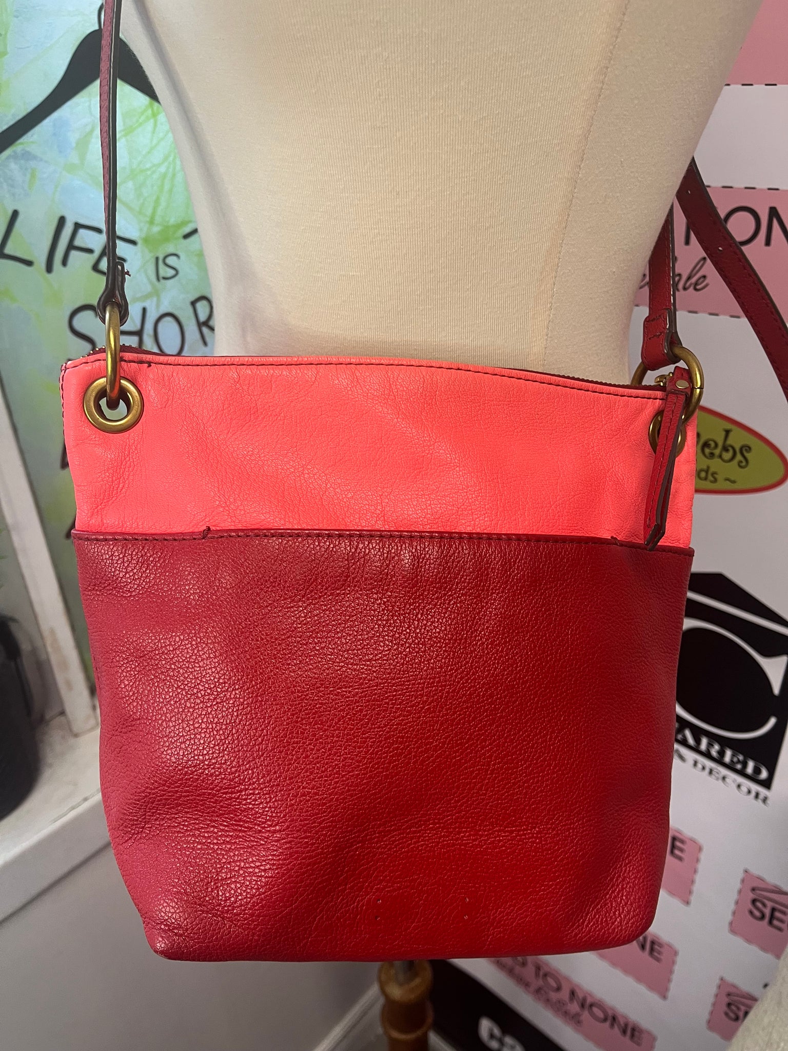 Effortlessly stylish and functional, the Two-Tone Fossil Leather Crossbody is the perfect accessory for any outfit. Crafted from cherry red and neon pink leather, this purse features an adjustable red leather strap and buckle for a comfortable fit. The brass metal accents add a touch of sophistication, while the two exterior open pockets and zippered main compartment provide ample storage for all your essentials. Stay organized on the go with this chic and practical crossbody purse.