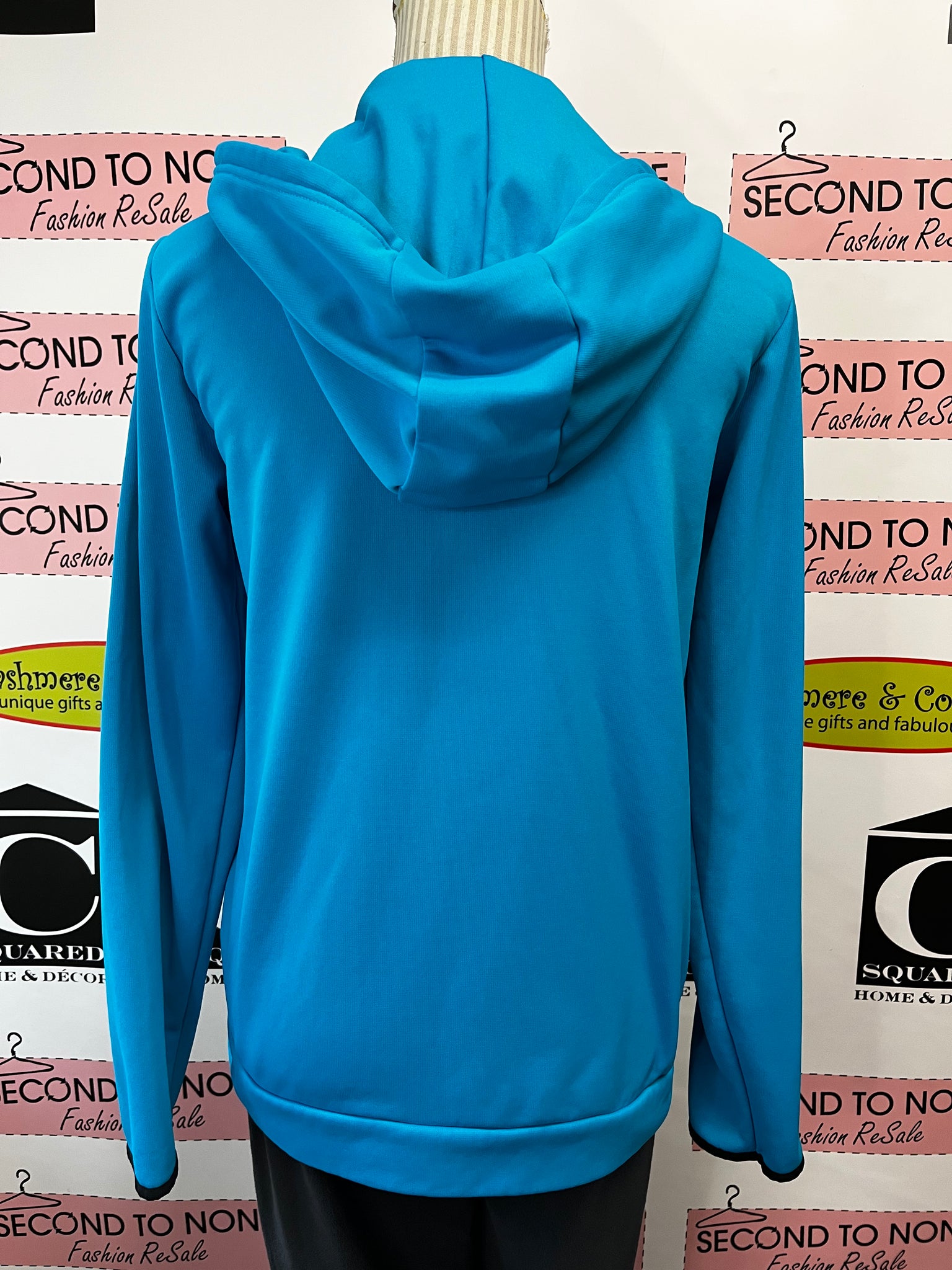 Stay cool and comfy in this bright blue Under Armour hoodie, perfect for your active lifestyle. Featuring a zip-up front and playful black accents, it blends sporty style with easy wearability. Sized YXL (equivalent to M), it’s your go-to for workouts or casual days with a pop of color.