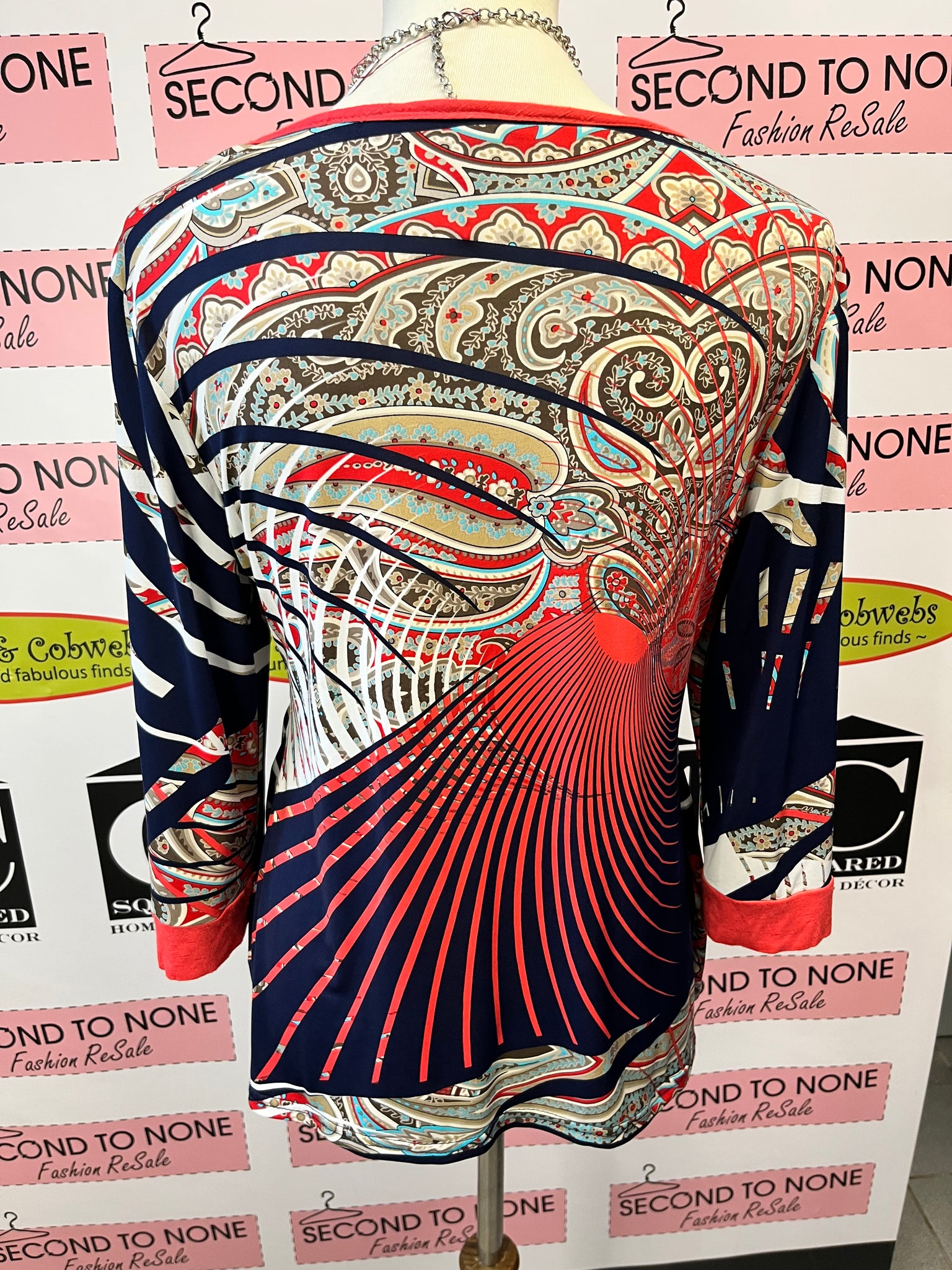 Add some personality to your wardrobe with our Unique Paisley Print Fooler Top. This Michael Tyler top features a playful white, coral, and navy paisley print, and gives the illusion of two layers without the extra bulk. Perfect for those who want to stand out without taking themselves too seriously.