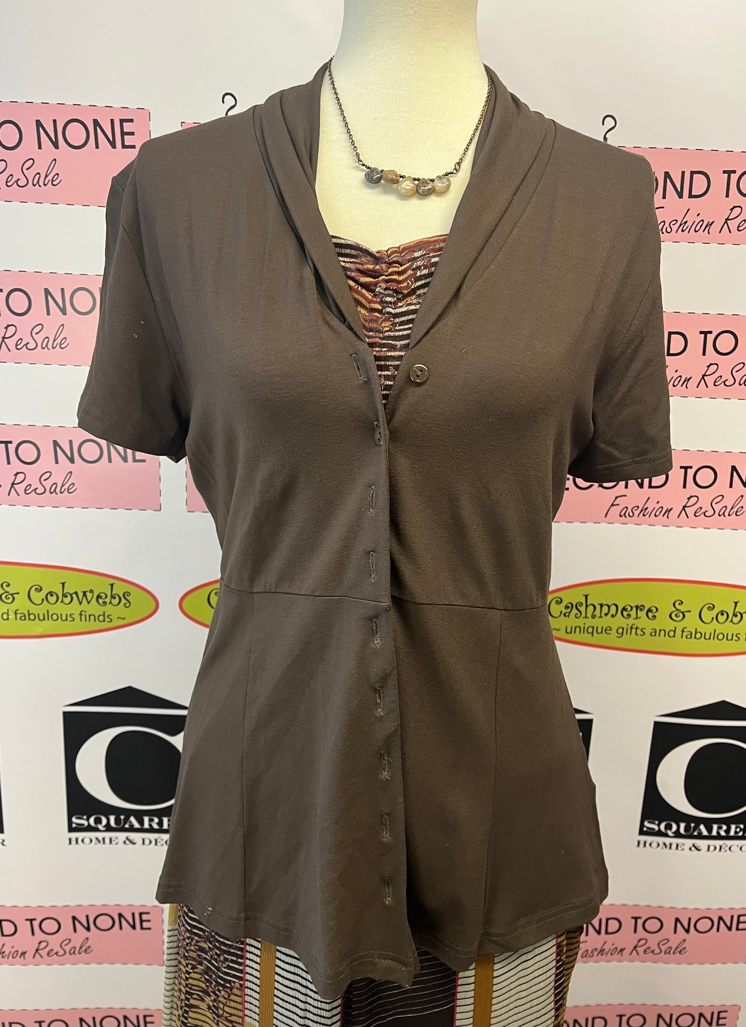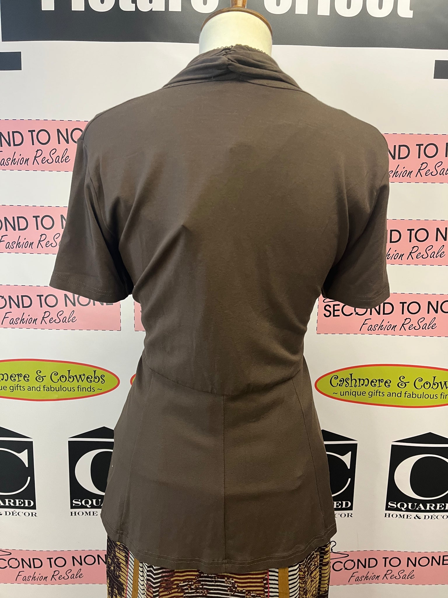 Indulge in the sweet and chic style of our Unique Short Sleeve Cardigan from Beutler Swiss Design. The chocolate brown color adds a touch of luxury, while the shawl collar and button front make for a playful and versatile look. Perfect for any occasion, this cardigan is sure to be your go-to.