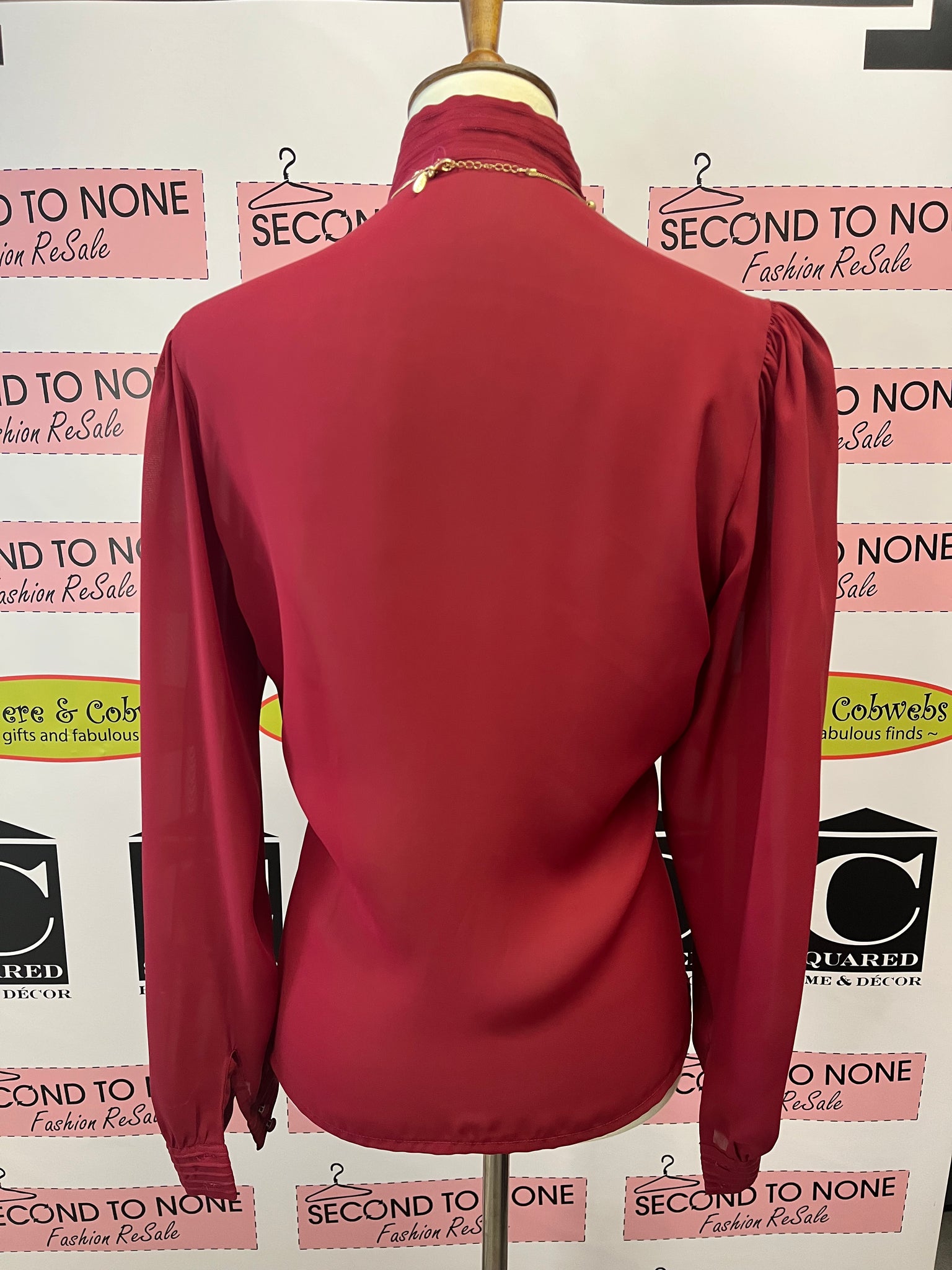 Indulge in vintage charm with this sophisticated burgundy blouse from Elite International. Featuring delicate pleats along the front, cuffs, and neckline, this size 12 blouse exudes elegance. The side button detail at the neck adds a touch of exclusivity to this timeless piece.