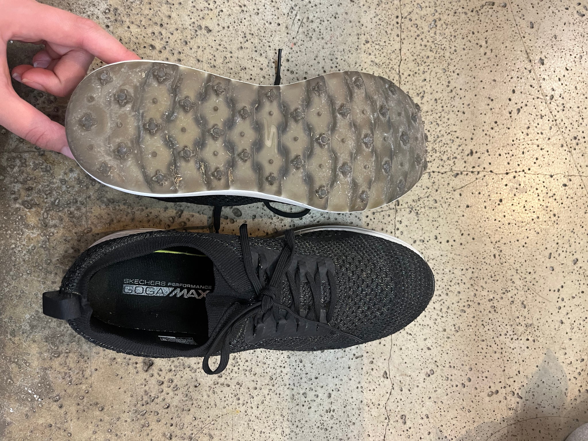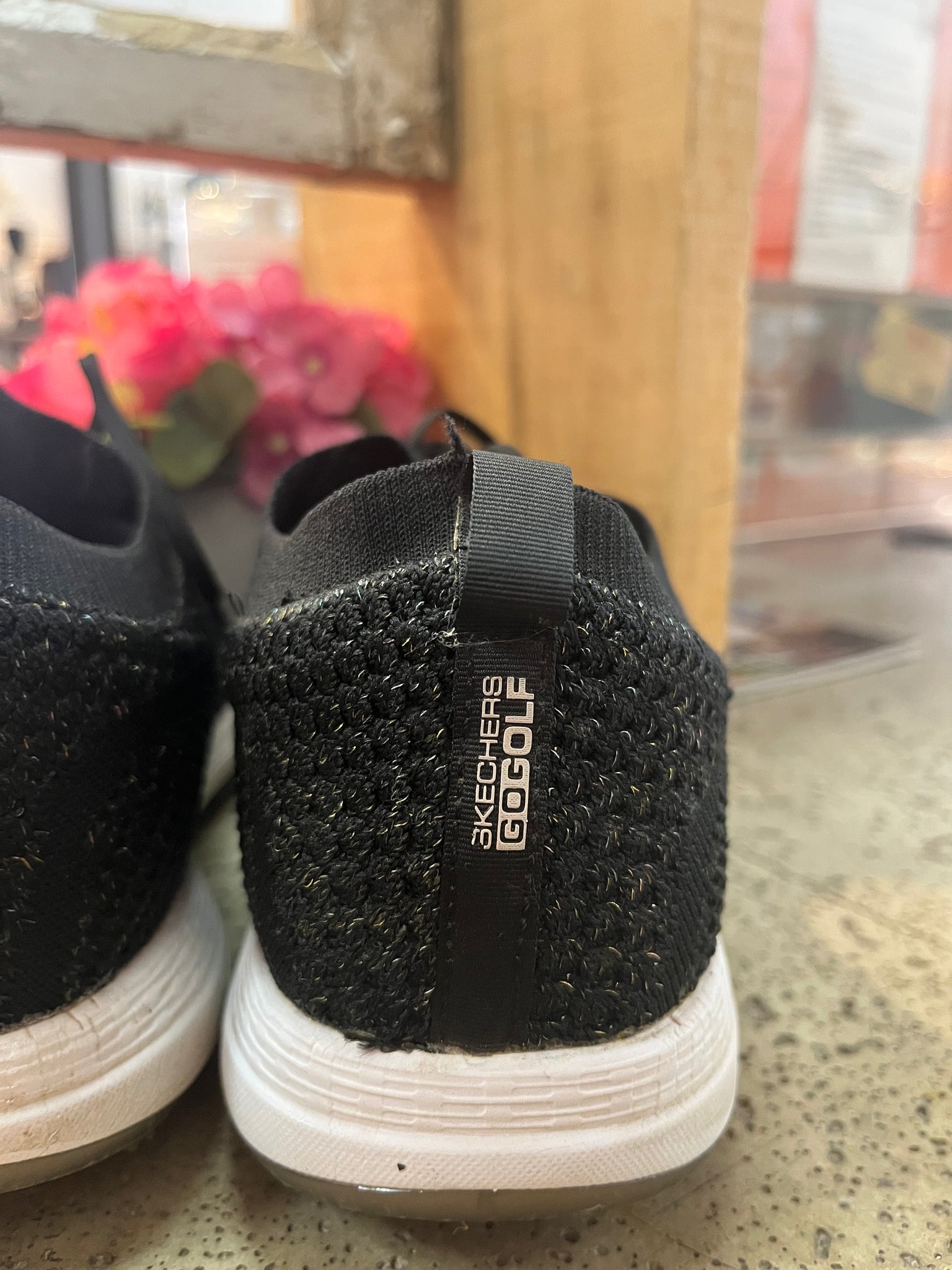 Upgrade your golf game with the Skechers Go Golf Shoes! These black shoes with subtle glittery specks throughout offer a touch of style to your golfing outfit. The lightweight and cushioned Ultra Flight design will keep your feet comfortable through every swing. This spikeless shoe features TPU nodules on the outsole providing ultimate traction without damaging the course or bugging your feet. Size 8.5 (Fore!)