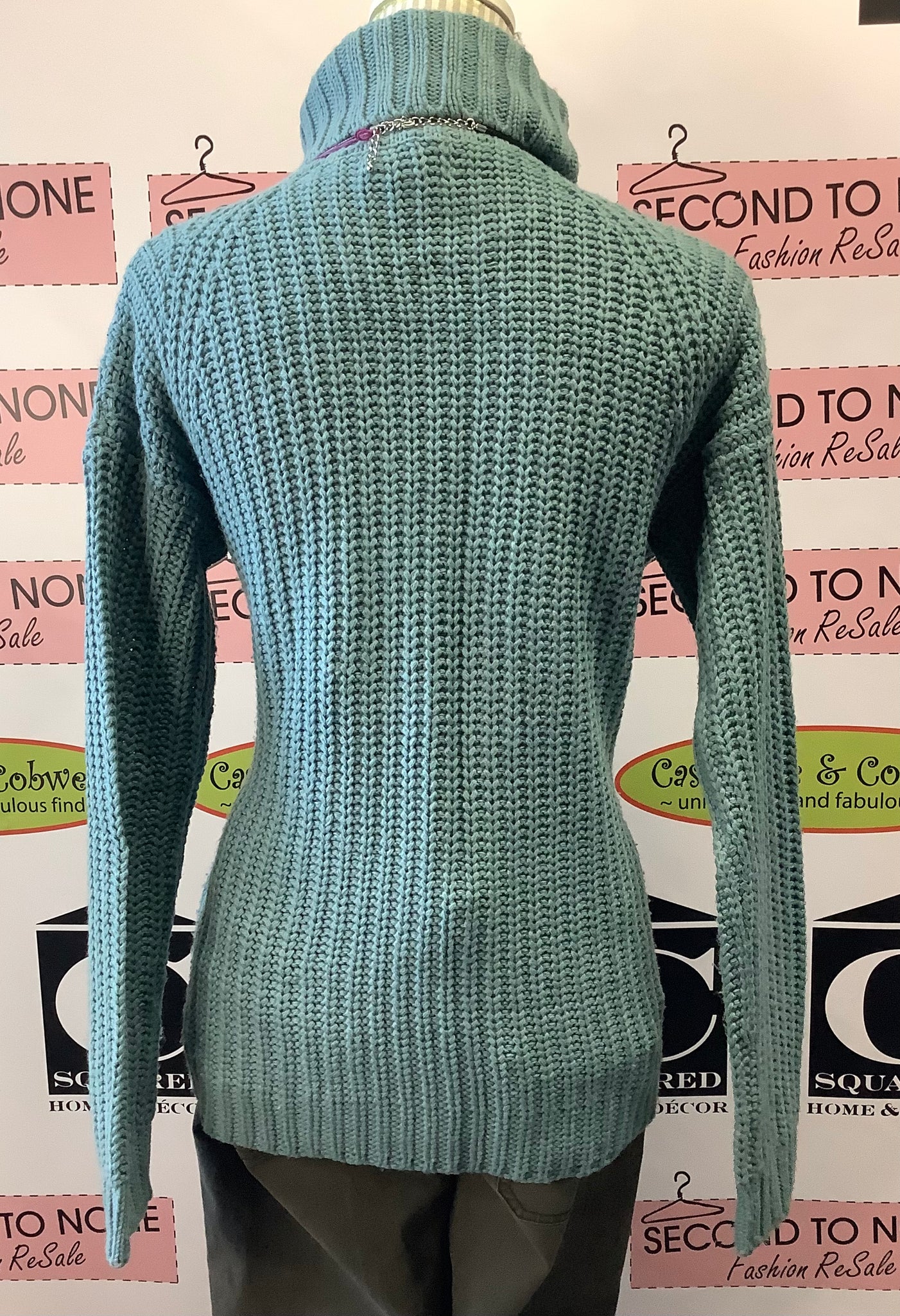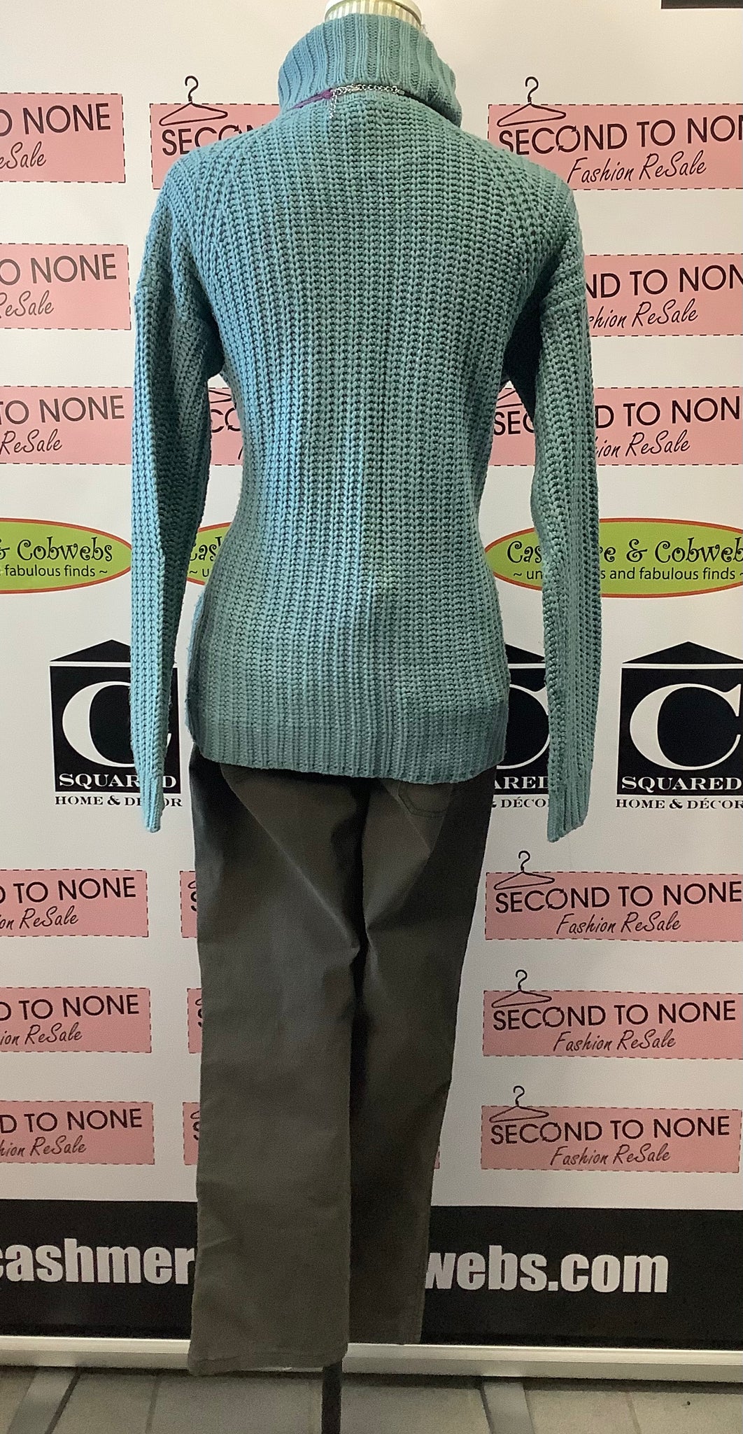 This is not your average bulky sweater, it is a stellar bulky sweater! An over-sized turtleneck plus some absolutely unique cross-tie fasteners along each side give this piece a gold star in our books. Just add your favourite bottoms! 100% Acrylic.