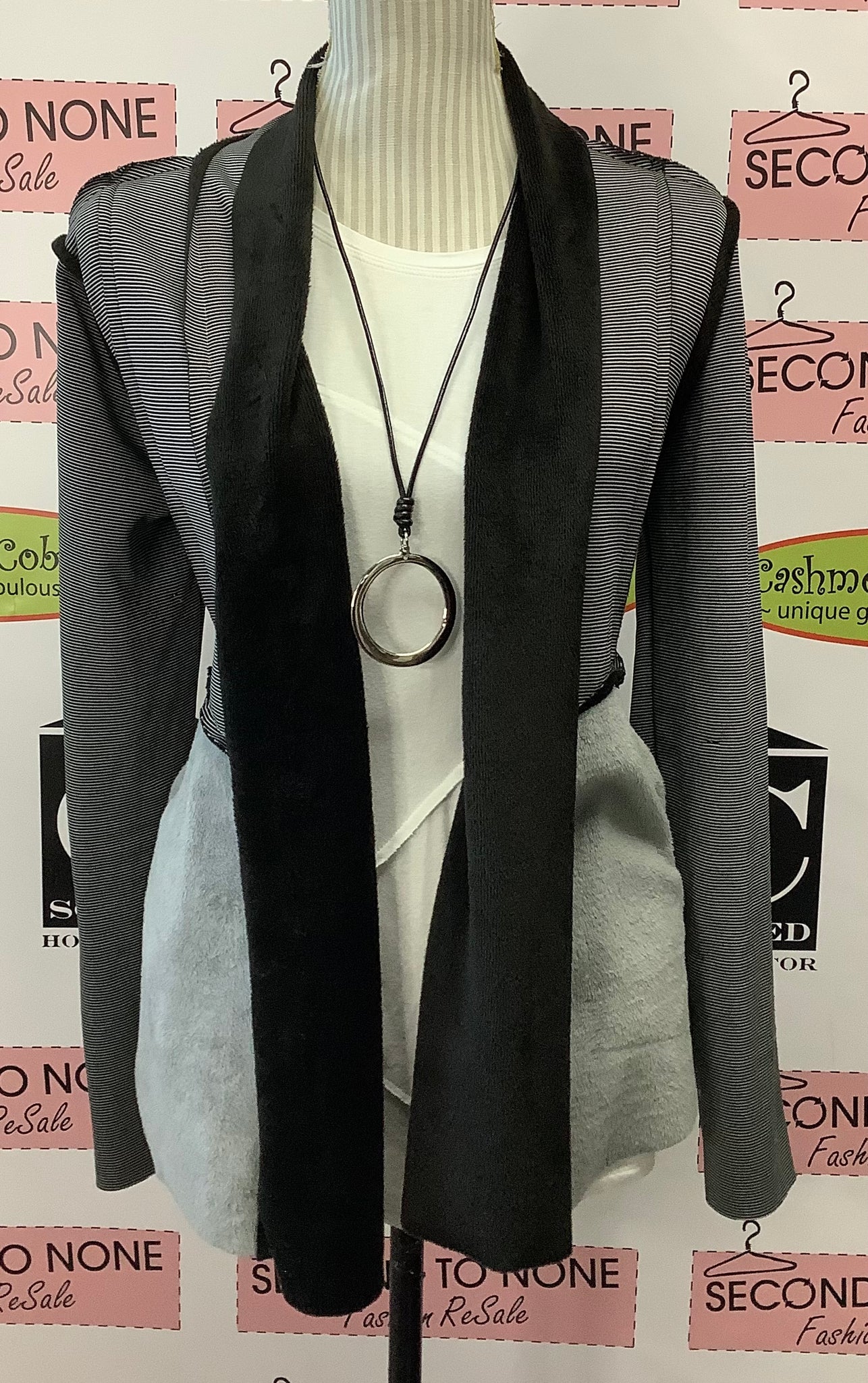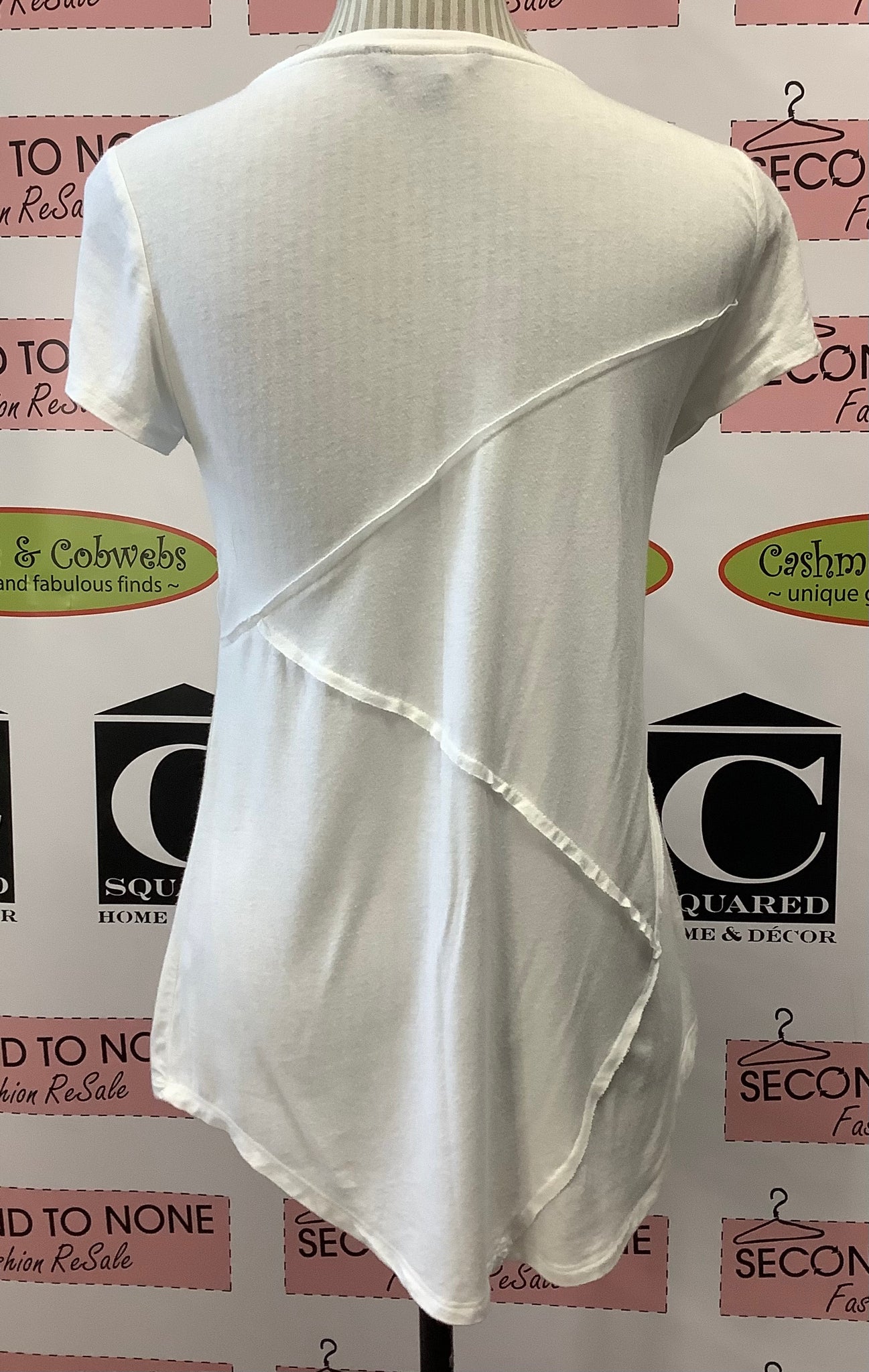 This Vera Wang Raw Edge Top offers a chic and modern take on the classic white tee. Made with a raw edge diagonal pattern, it features a flattering longer fit, short sleeves, and a rounded hemline. Perfect for adding a touch of sophistication to any casual look.
