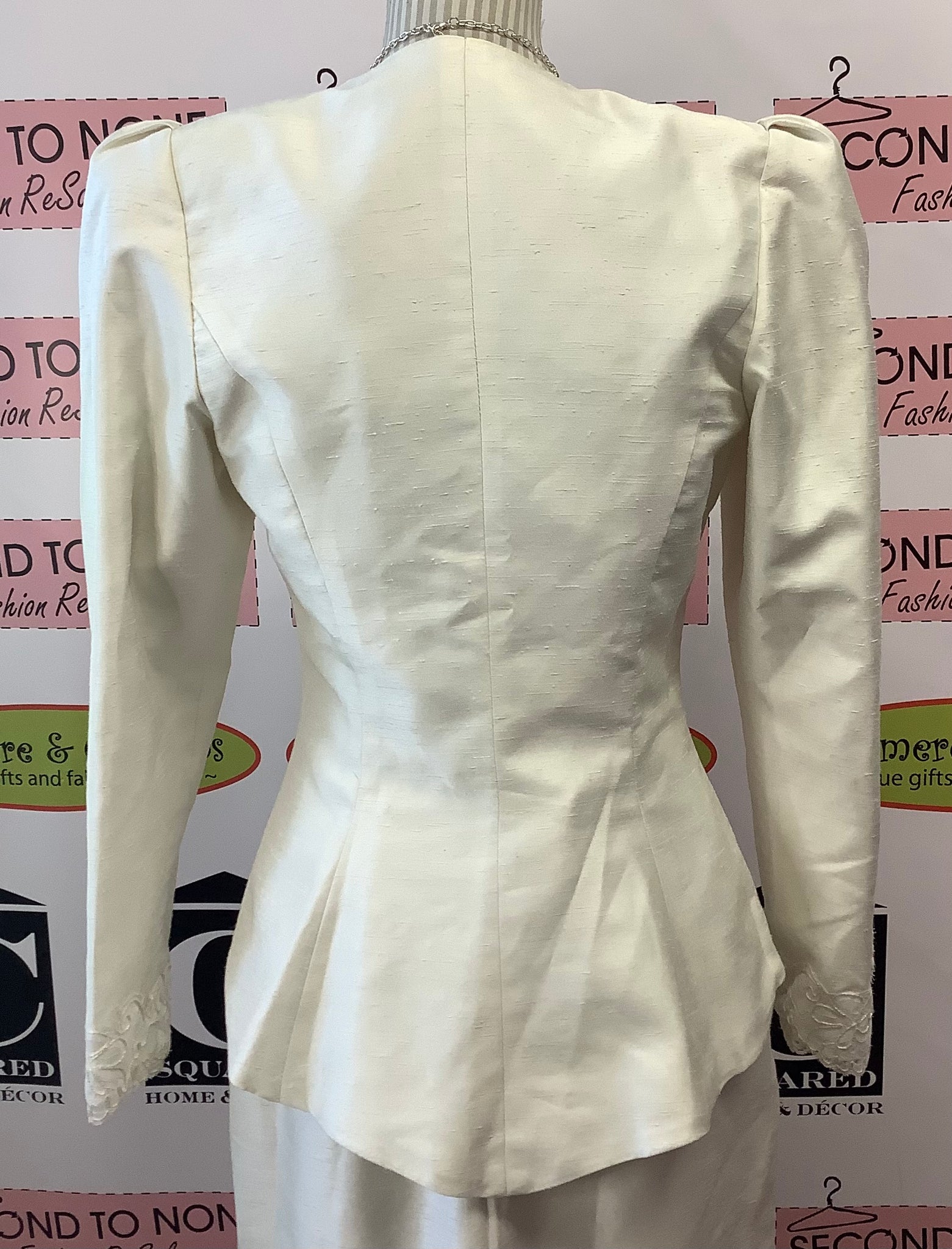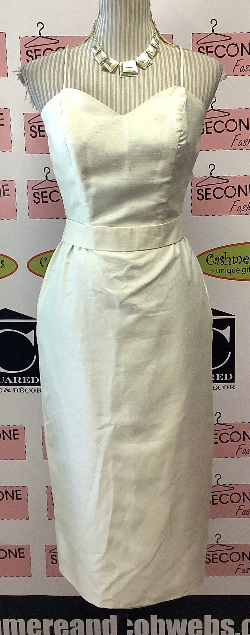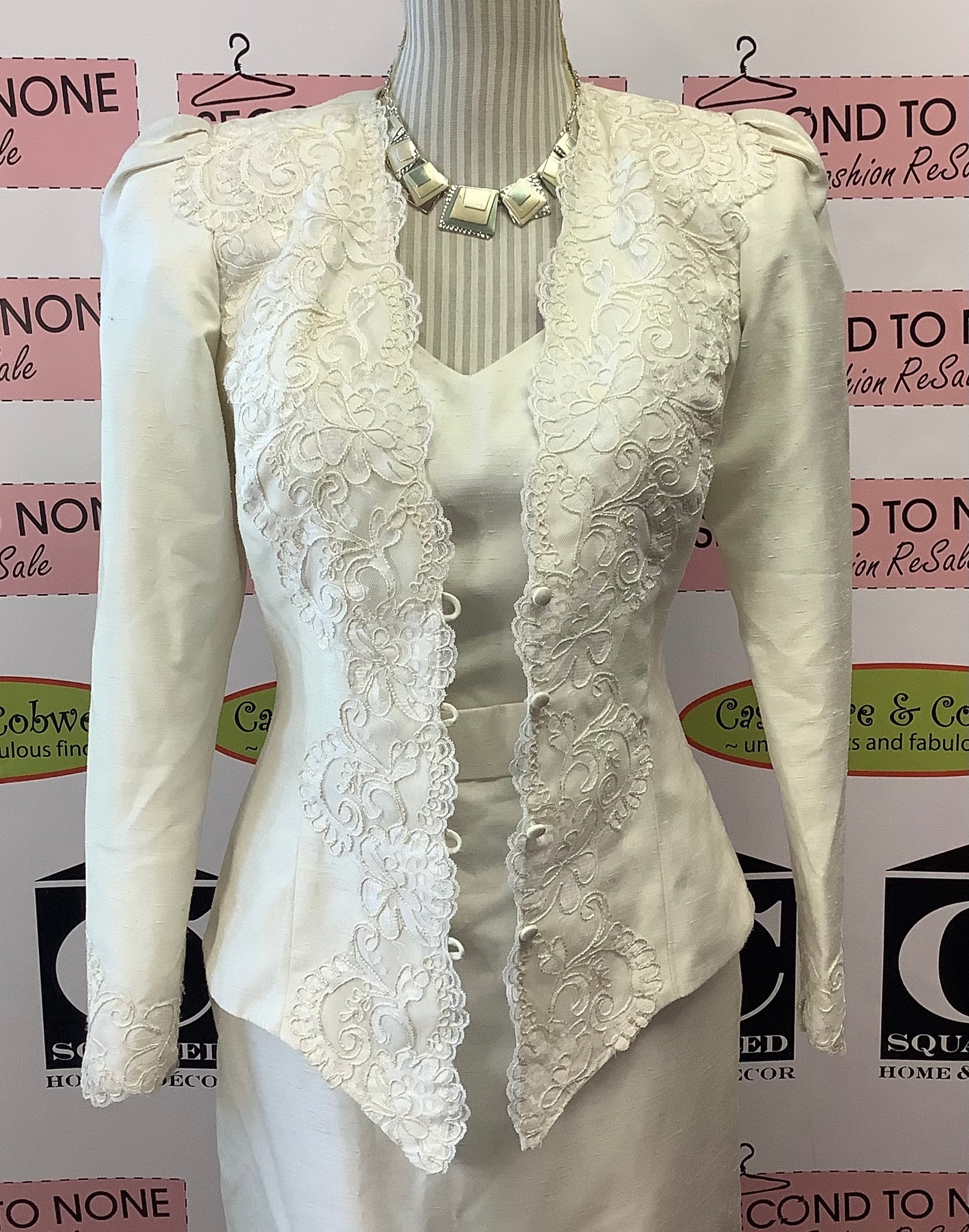 Make a timeless statement with this vintage-inspired dress and matching lace coat. Crafted from cream-colored material, the sweetheart neckline and spaghetti straps lend a classic silhouette, while the rear zipper closure and coordinating belt help create a flattering, hourglass shape. Complete with shoulder pads and a pointed hemline, the jacket with its delicate lace overlay further enhances this luxurious set. Perfect for elevating any special occasion. Appears to be Silk/Cotton/Polyester.