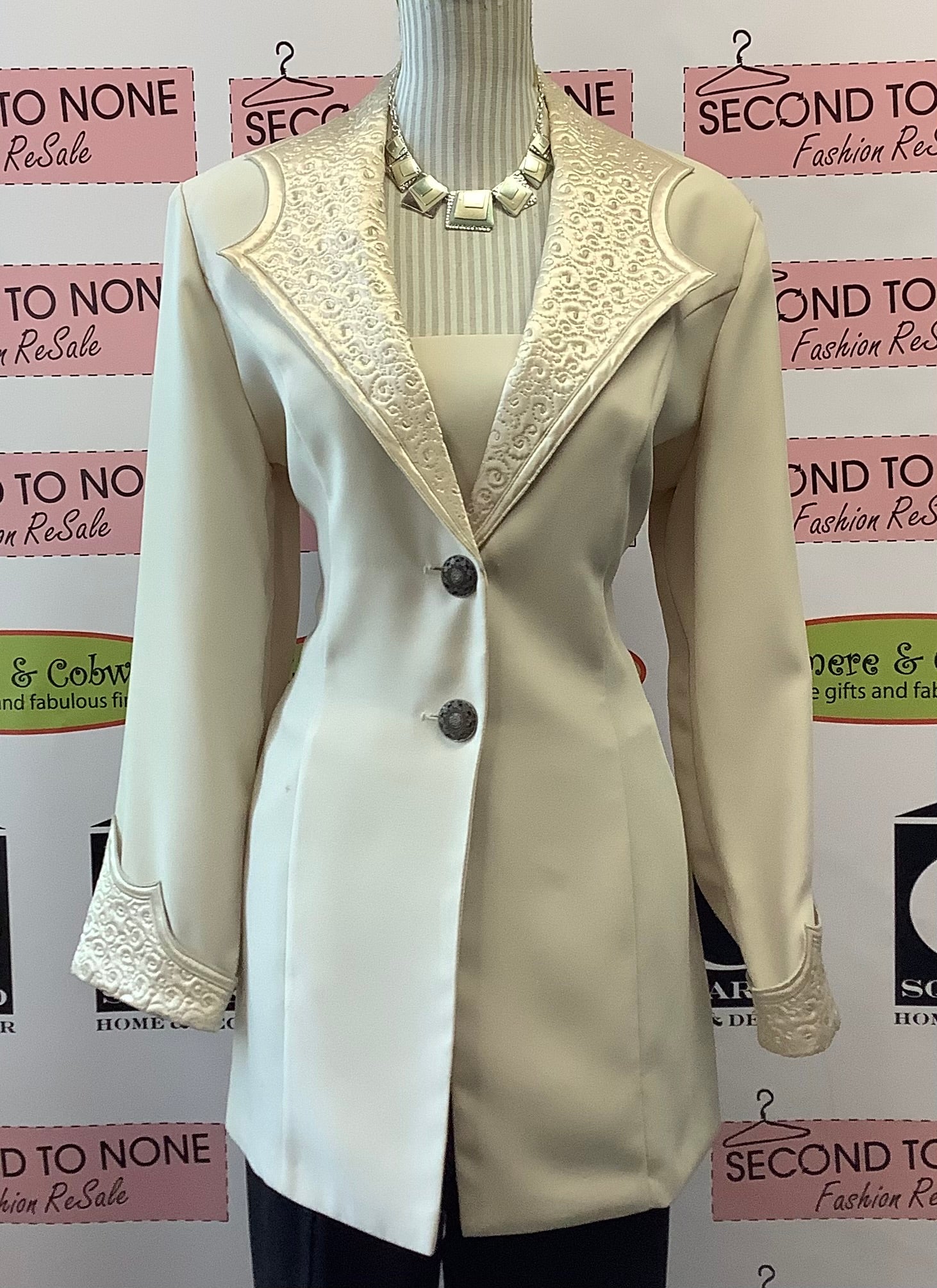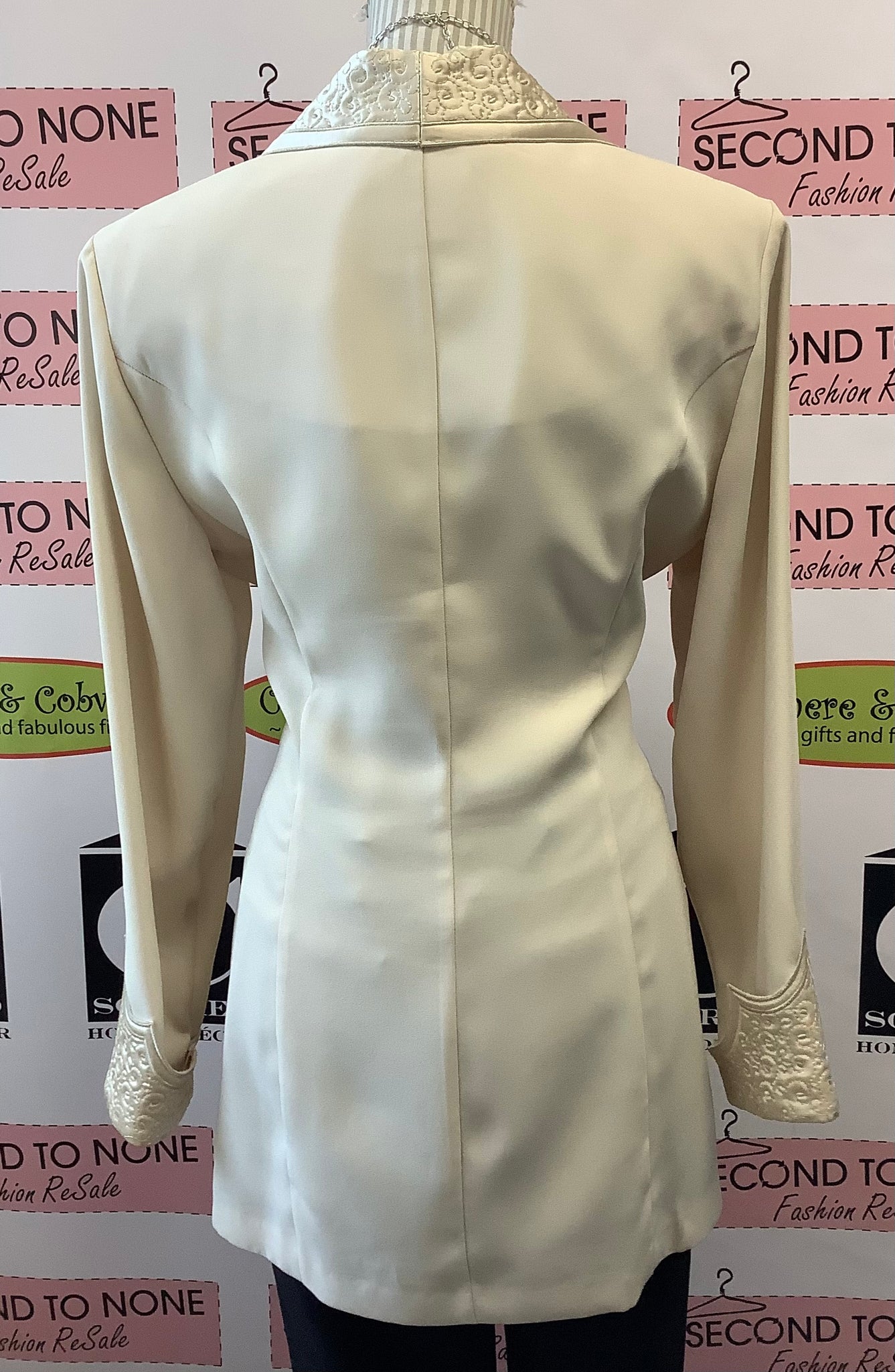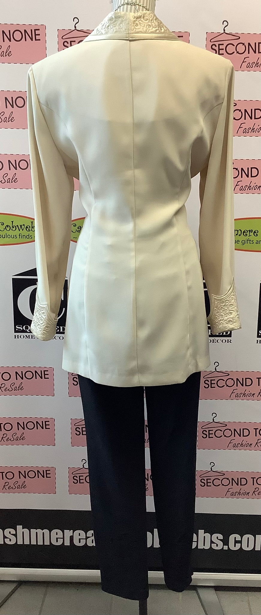 This timeless Vintage Joseph Ribkoff Long Blazer effortlessly blends sophistication and style. The cream piece is detailed with a funky collar and cuffs, as well as subtle micro-stitching accents. Cut to a long fit, the blazer is secured with a dual button closure and panel insert as faux top, guaranteeing a classic look that will stand the test of time. 100% Polyester. Combination 52% Acetate, 48% Rayon.