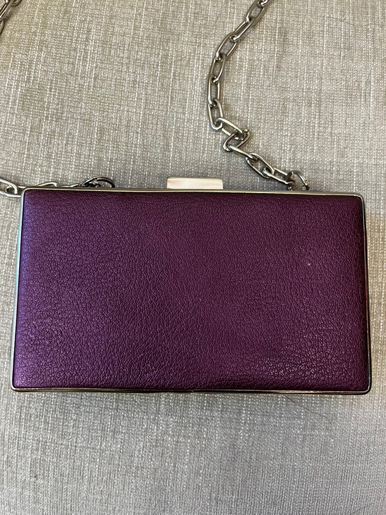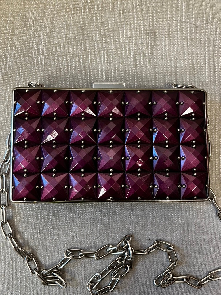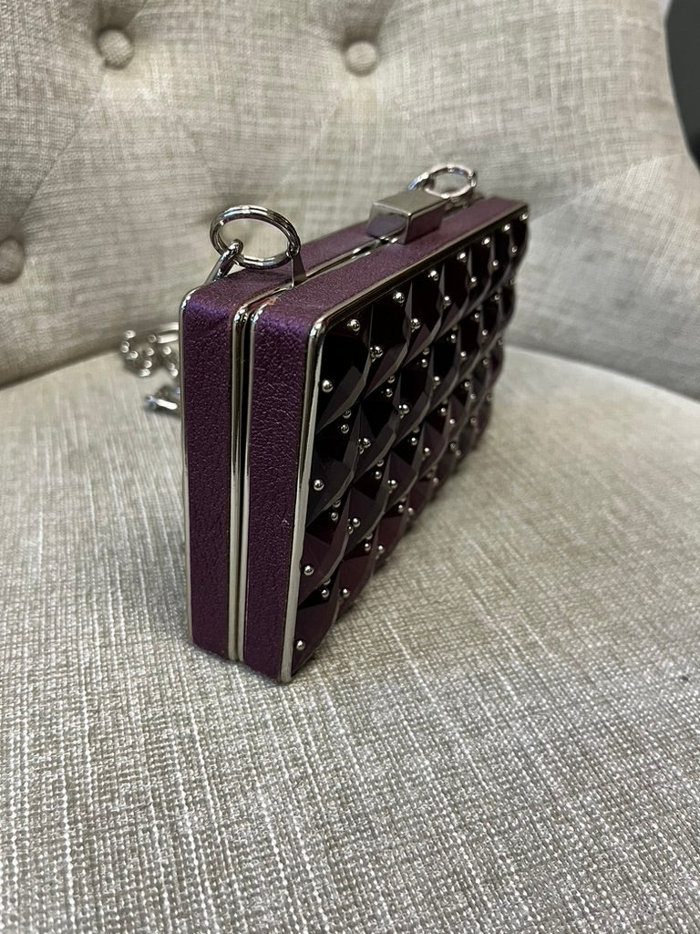 Unleash your inner vintage fashionista with this hinged evening bag from Nine West. The rectangle shape and metal chain strap add a touch of sophistication, while the playful purple color and stud details bring a quirky and unique flair. Perfect for adding a pop of personality to any outfit!