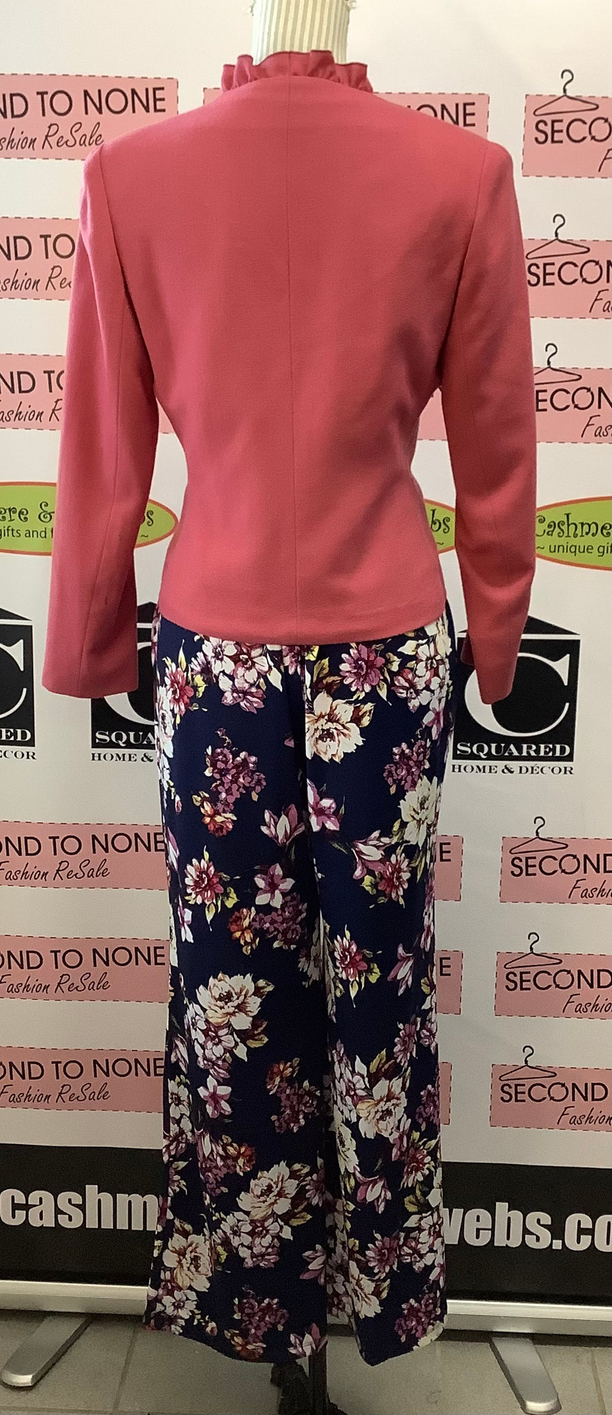 A classic staple for any wardrobe, this vintage pink ruffle jacket defines elegance and style. Boasting a triple covered-button closure, ruffle opening, darts, and long sleeves, this standard-fit piece makes for the perfect finishing touch to any outfit. A timeless vintage piece, you'll love the way it exudes sophistication and charm. 100% Wool.