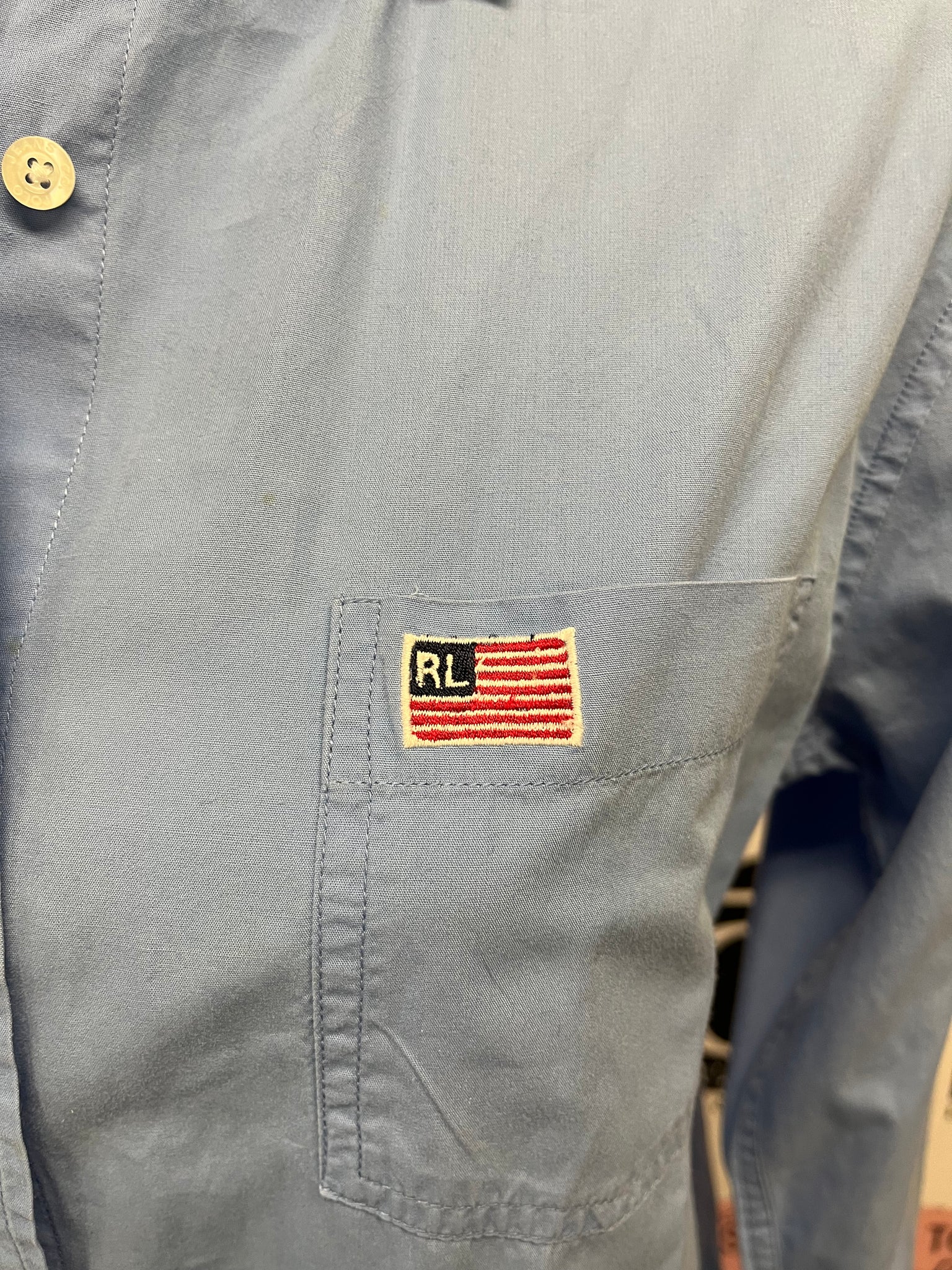 This Vintage Polo Ralph Lauren Cotton Shirt is a classic, preppy wardrobe staple. Made with 100% soft cotton, it features the iconic "RL" American flag patch embroidered on the front pocket. The branded off-white buttons add the little details that make this timeless piece as cool as it is. Size M.