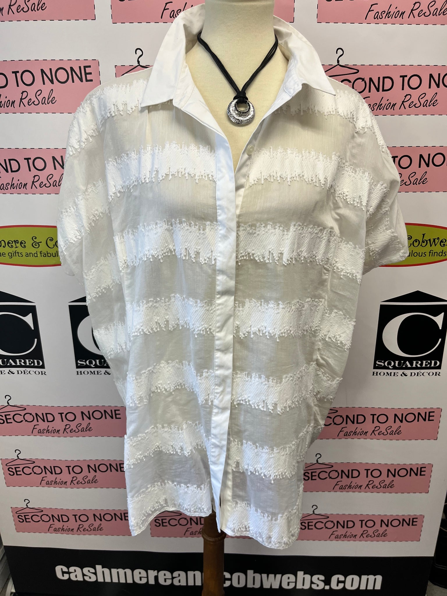 The perfect crisp, white & light-weight top for the summer. Its flowy design and button-front closure make it easy to wear with anything. The burnout details with sheer elements add a fun and dramatic effect, making it a must-have for any fashion-forward individual. Lafayette 148 brand. 89% cotton/11% polyamide