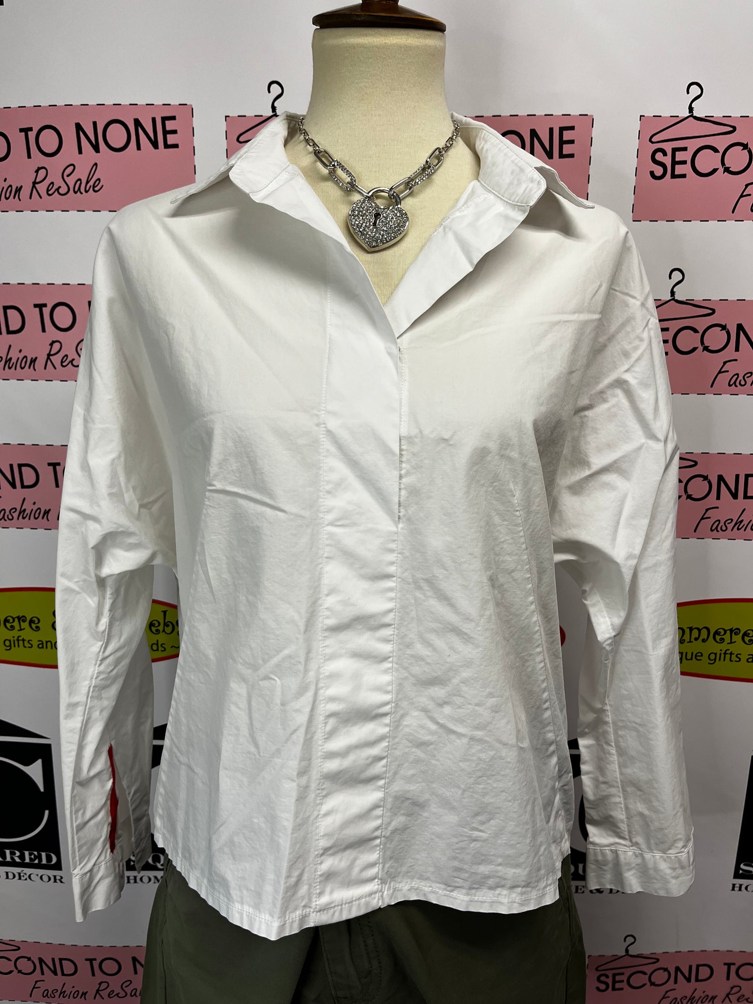 Get the perfect blend of classic and edgy with our White Collared Blouse! This top features a striking red accent and a stylish collared design. With a longer back and shorter front, it's versatile for any occasion. Plus, the fun button details on the back add a playful twist. Size not indicated but fits like a M.