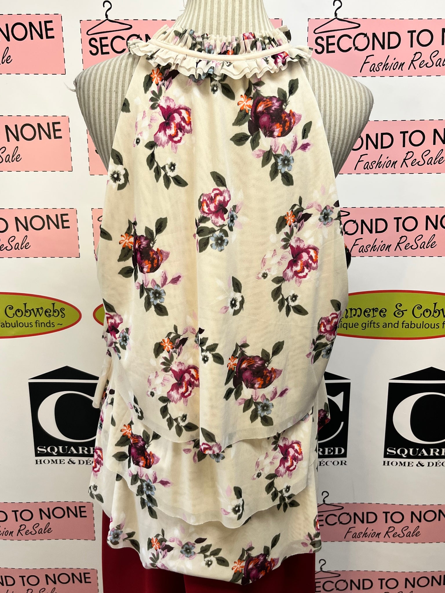 This playful tiered sleeveless blouse features a beautiful floral pattern that brings a fresh, lively vibe to your wardrobe. The charming tie neckline adds a flirty touch, while the fully-lined design ensures comfort and quality. Perfect for sunny days or layering under a jacket, this gorgeous blouse in size L is a delightful way to brighten any outfit. 100% polyester.