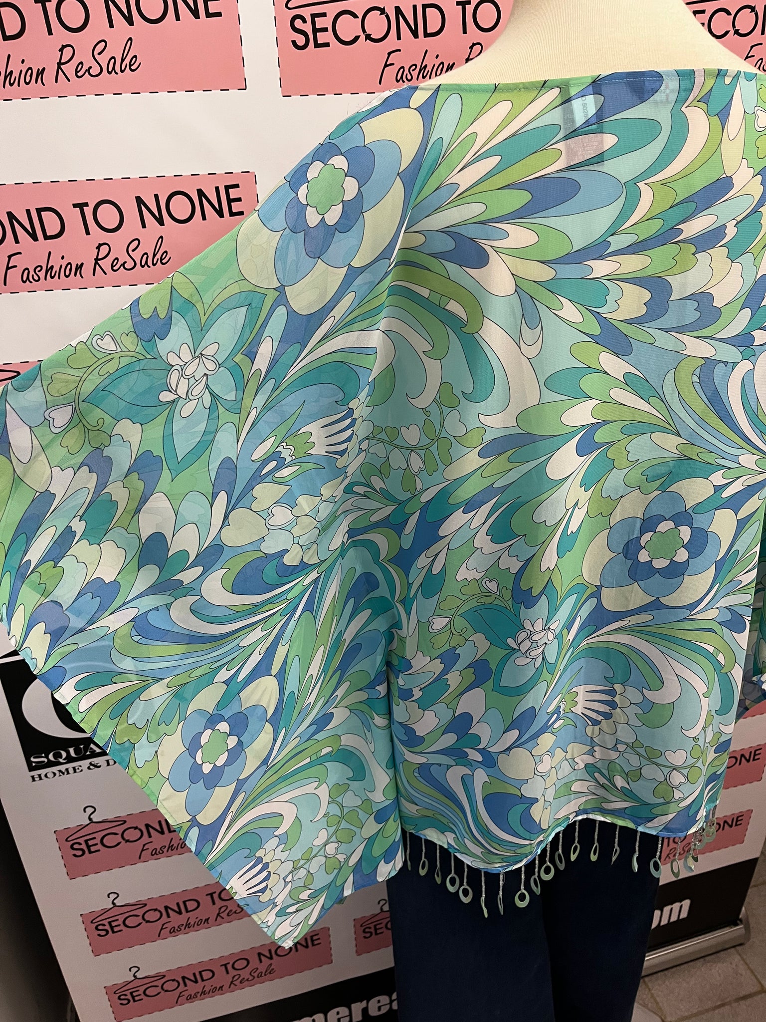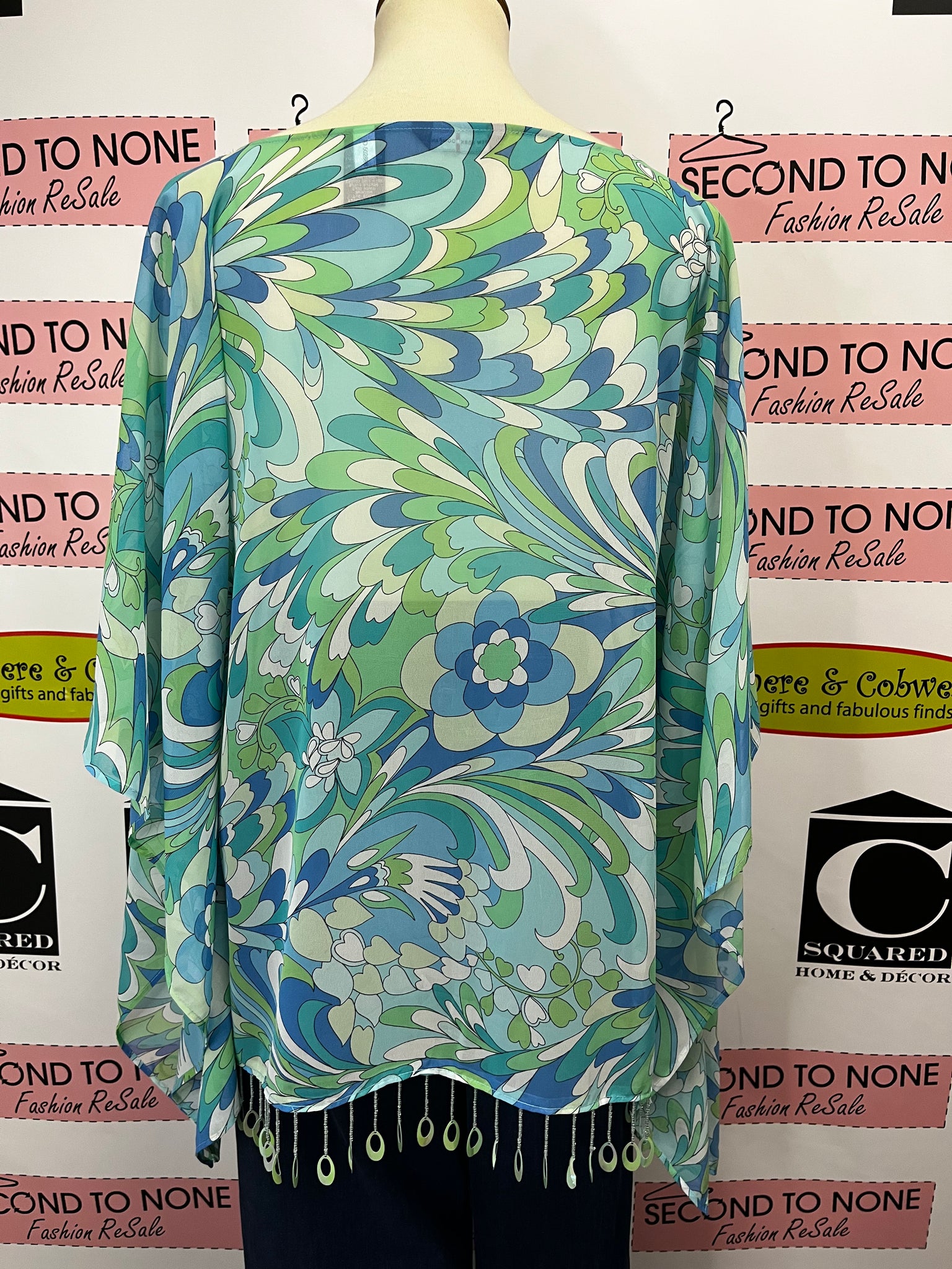 Get ready to shine in this funky Wide Sleeve Sequin Fringe Top from New York & Company! The blue, white, and green pattern is both eye-catching and playful, while the relaxed fit and wide batwing sleeves provide a flattering and comfortable look. And let's not forget the sheer-like material and sequin fringe, adding a touch of fun and sparkle to any outfit. Get ready to turn heads with this top!