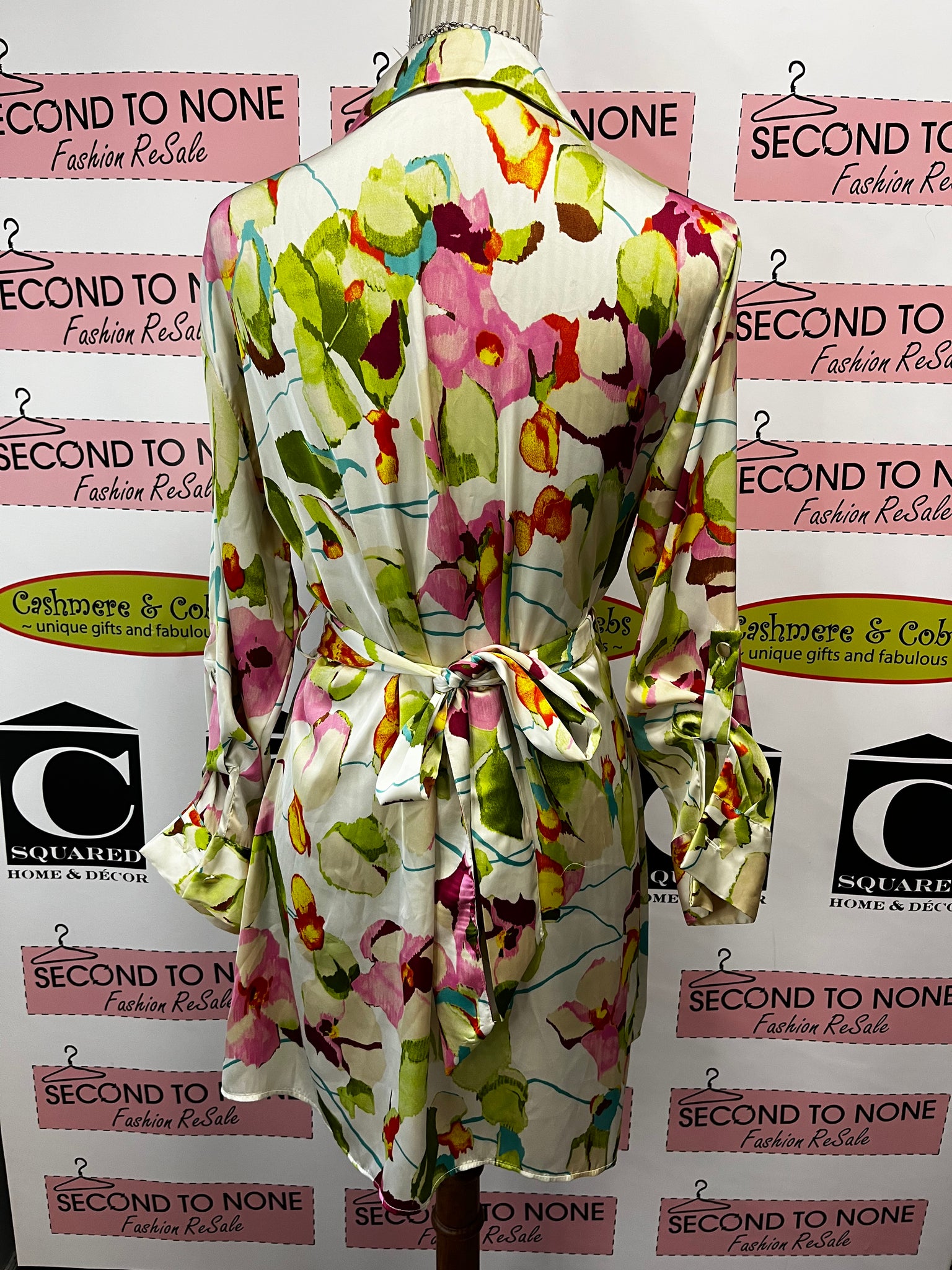 This Zara belted shirt dress in cream satin features a lively watercolor print that adds a splash of color to your wardrobe. With long sleeves, a classic collar, and a button-up front, it combines timeless style with a playful twist. The fun belt accent cinches the waist for a flattering silhouette, making it perfect for casual days or dressier occasions. Embrace effortless charm and vibrant flair in this eye-catching dress.