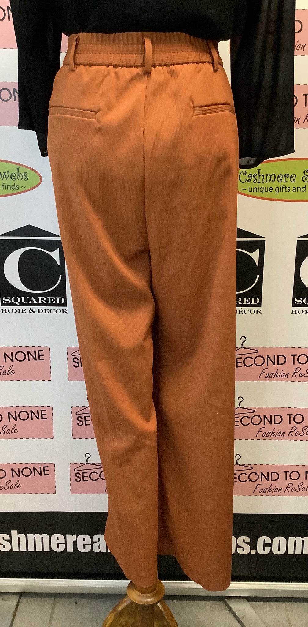 Step into fall with these Zara burnt orange pants, designed to bring pumpkin spice vibes to your wardrobe. The pleated fabric and cinched waistband with belt loops create a flattering, comfy fit perfect for cooler September and October days. Featuring front functional pockets and a button-zipper enclosure, they pair effortlessly with chunky black boots for a look that's super awesome and totally lovely. Embrace the season in style!