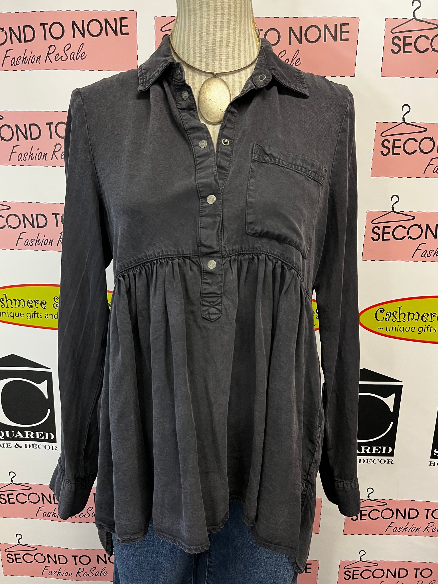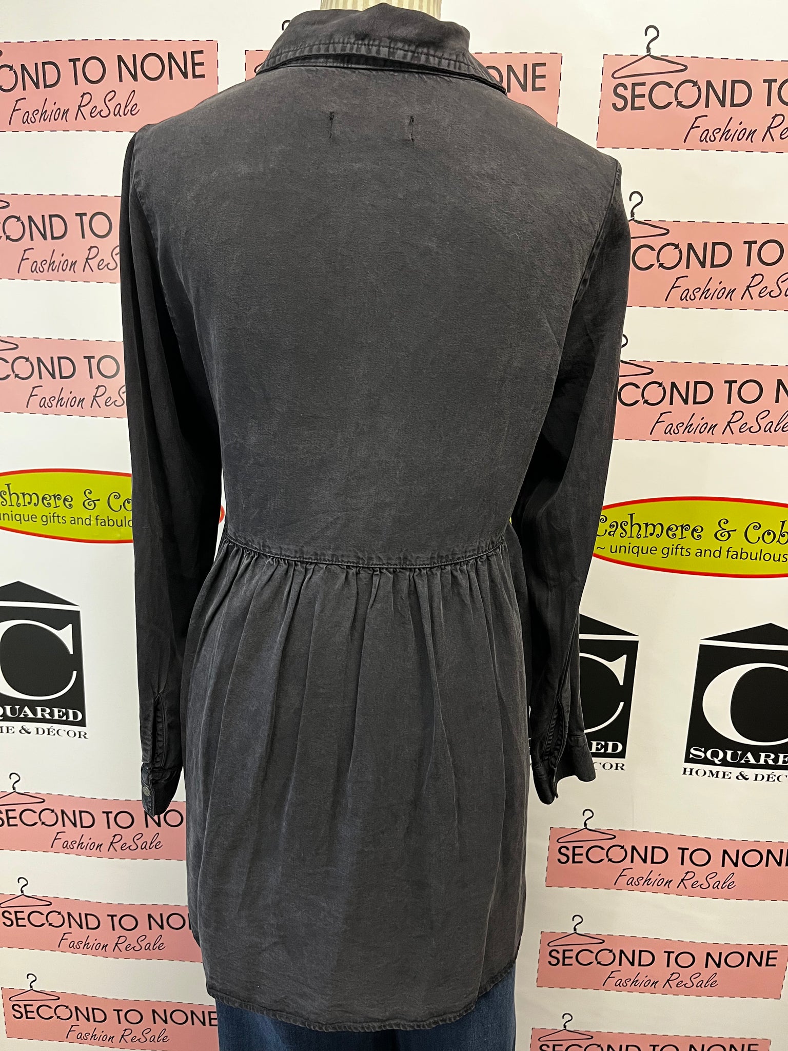 This playful Zara Denim Tunic in dark grey features a trendy hi-lo hem that adds fun movement to your look. Crafted from stonewash denim, it offers a soft, worn-in feel perfect for everyday wear. The half-button front and classic collar give it a stylish edge, while long sleeves make it a versatile piece for layering or solo styling. Perfect for adding a cool, casual vibe to your wardrobe!