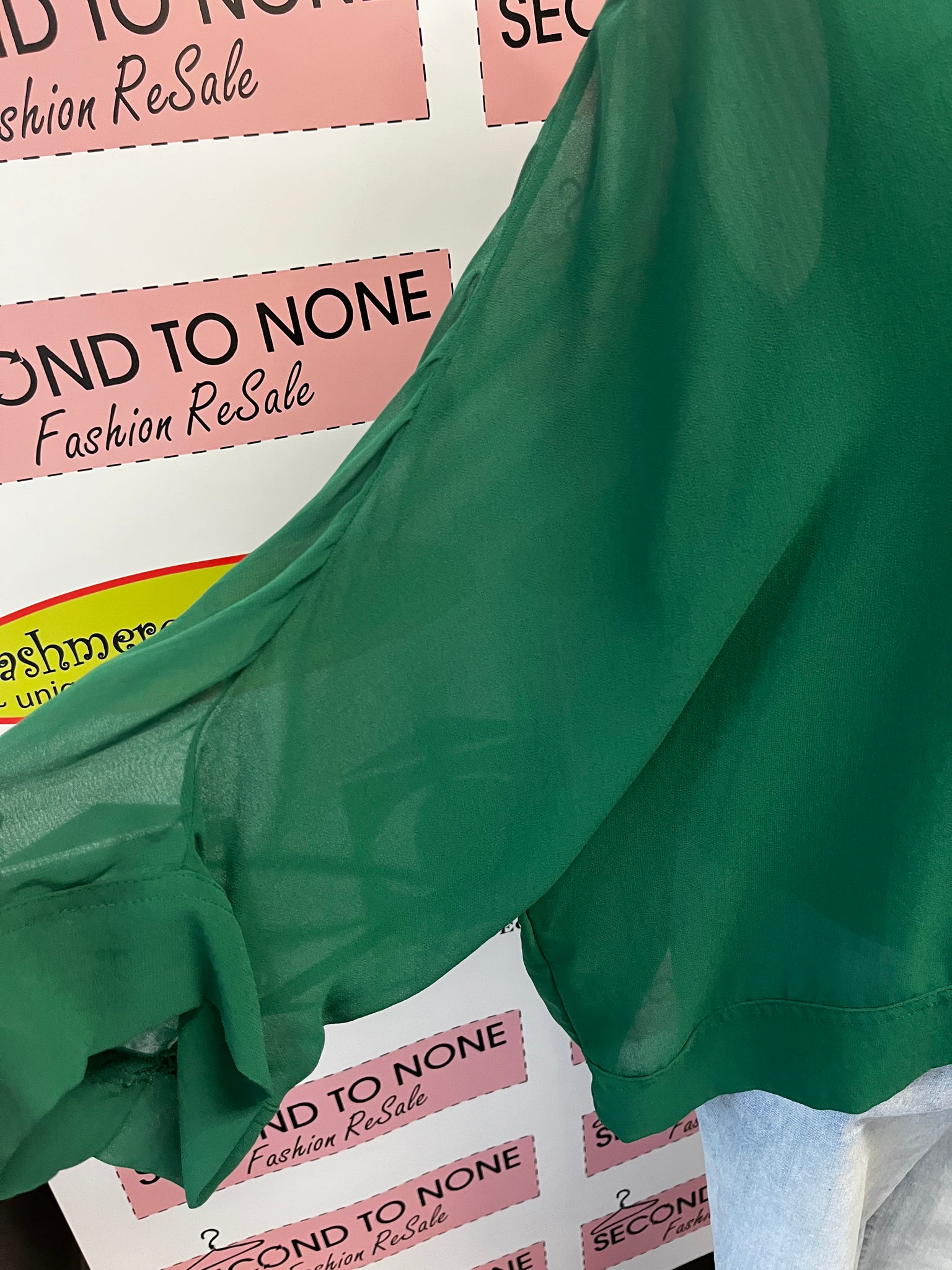 Add a pop of fun and color to your wardrobe with this Zara Green Sheer Top. The bright green sheer overlay paired with a tank inside lining creates a playful, oversized flowy fit. Perfect for any occasion, this v-neck top is a must-have from Zara.