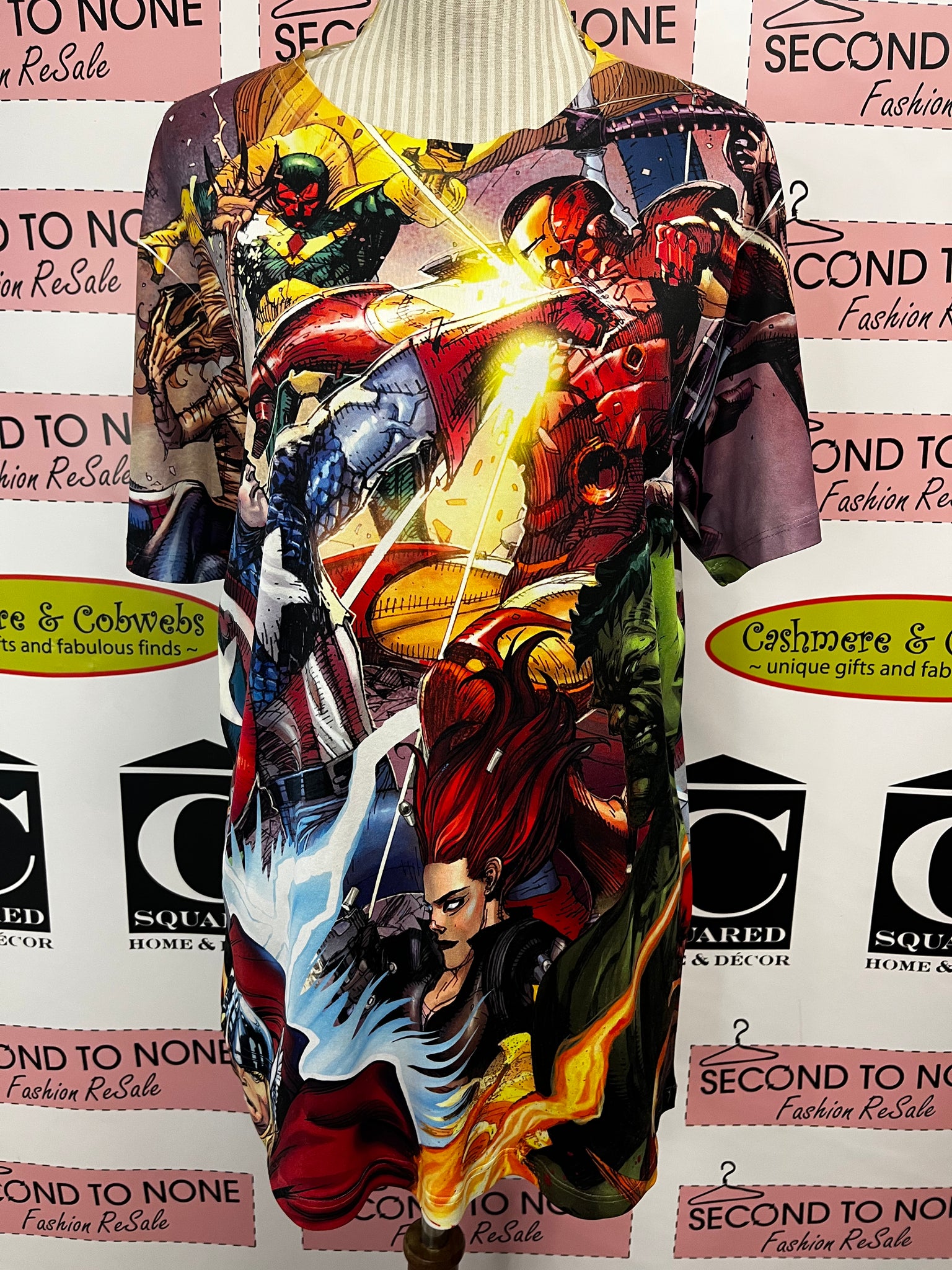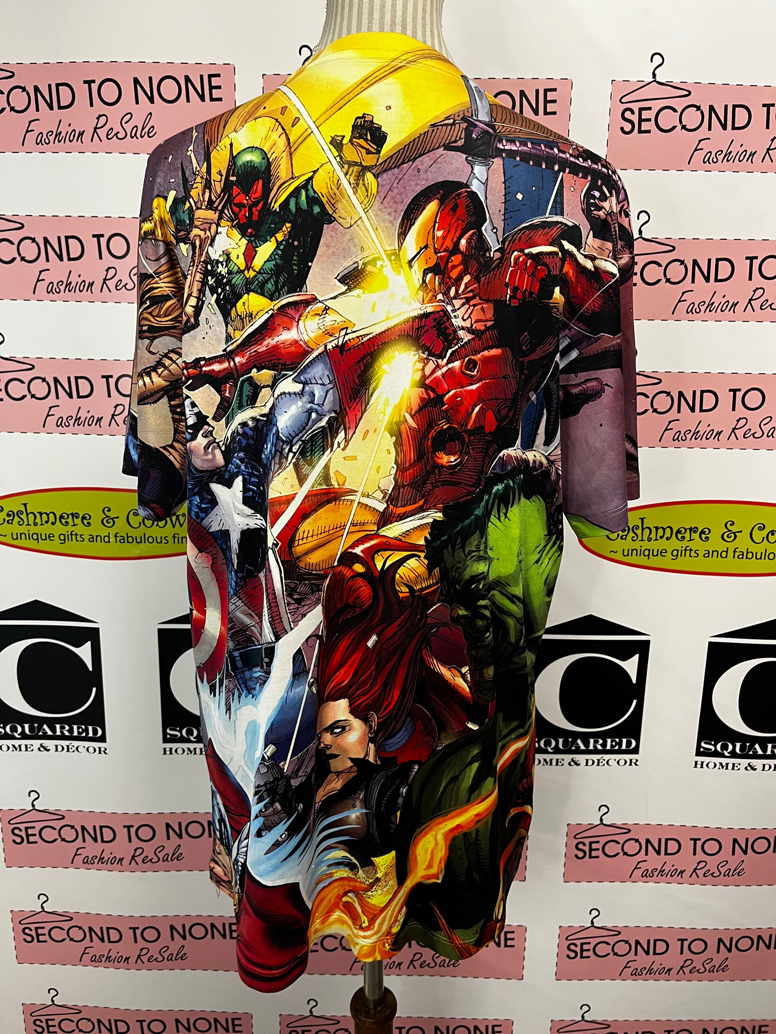 Rock your inner superhero with this playful Marvel Avengers graphic tee featuring an epic collage of your favorite comic book legends. Crafted from stretchy, comfortable fabric, this unisex design fits all body types and moves with you throughout the day. Perfect for Marvel fans who want to wear their fandom with style and comfort. Whether you're heading to Comic-Con or just showing your love for the Avengers, this tee delivers serious character appeal in a casual, wearable package.