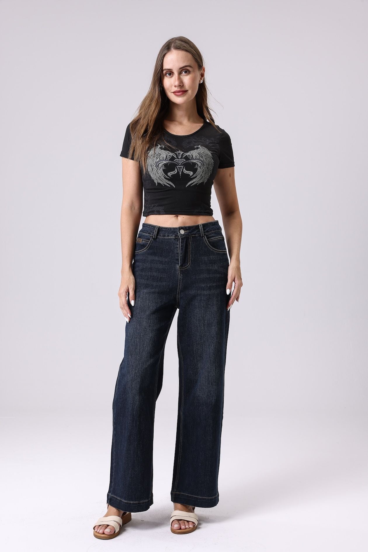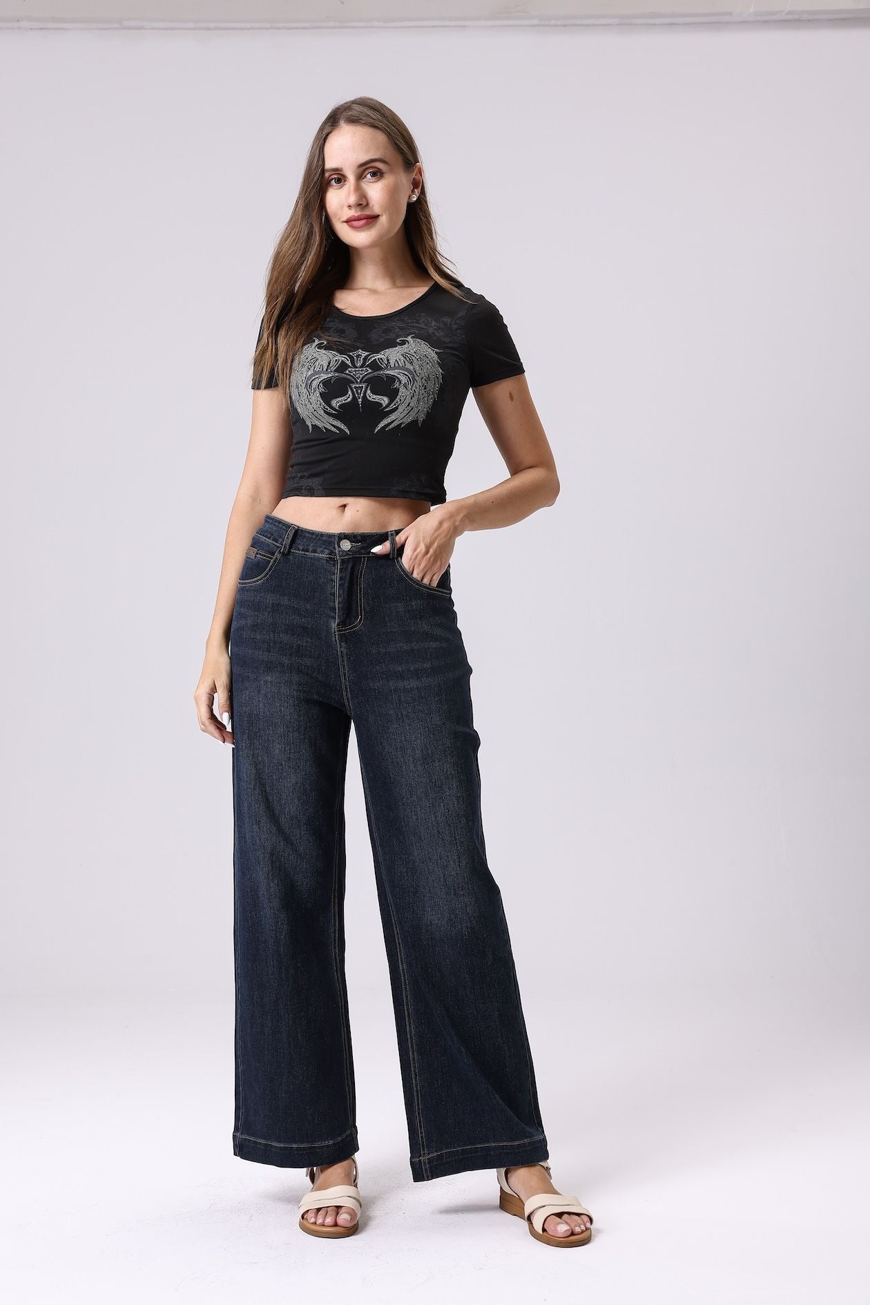 These high-rise wide-leg jeans are your new wardrobe MVP. The dark wash keeps things sleek and versatile, while the stretchy fabric moves with you all day without sacrificing that flattering silhouette. High-waisted styling elongates your frame and hits all the right notes for current trends. Comfortable enough for everyday wear, polished enough for nights out—slip them on and feel the difference.