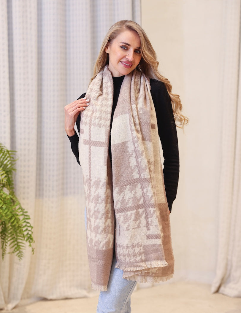 **Wrap yourself in pure drama.** This houndstooth blanket scarf is your ticket to effortless elegance—drape it over your coat for an instant style upgrade, or snuggle into its impossibly soft embrace while lounging at home. The striking color palette transforms any moment into something special, whether you're stepping out into the world or settling in for a cozy night in. Versatile, luxurious, and undeniably chic. 70% viscose/30% wool