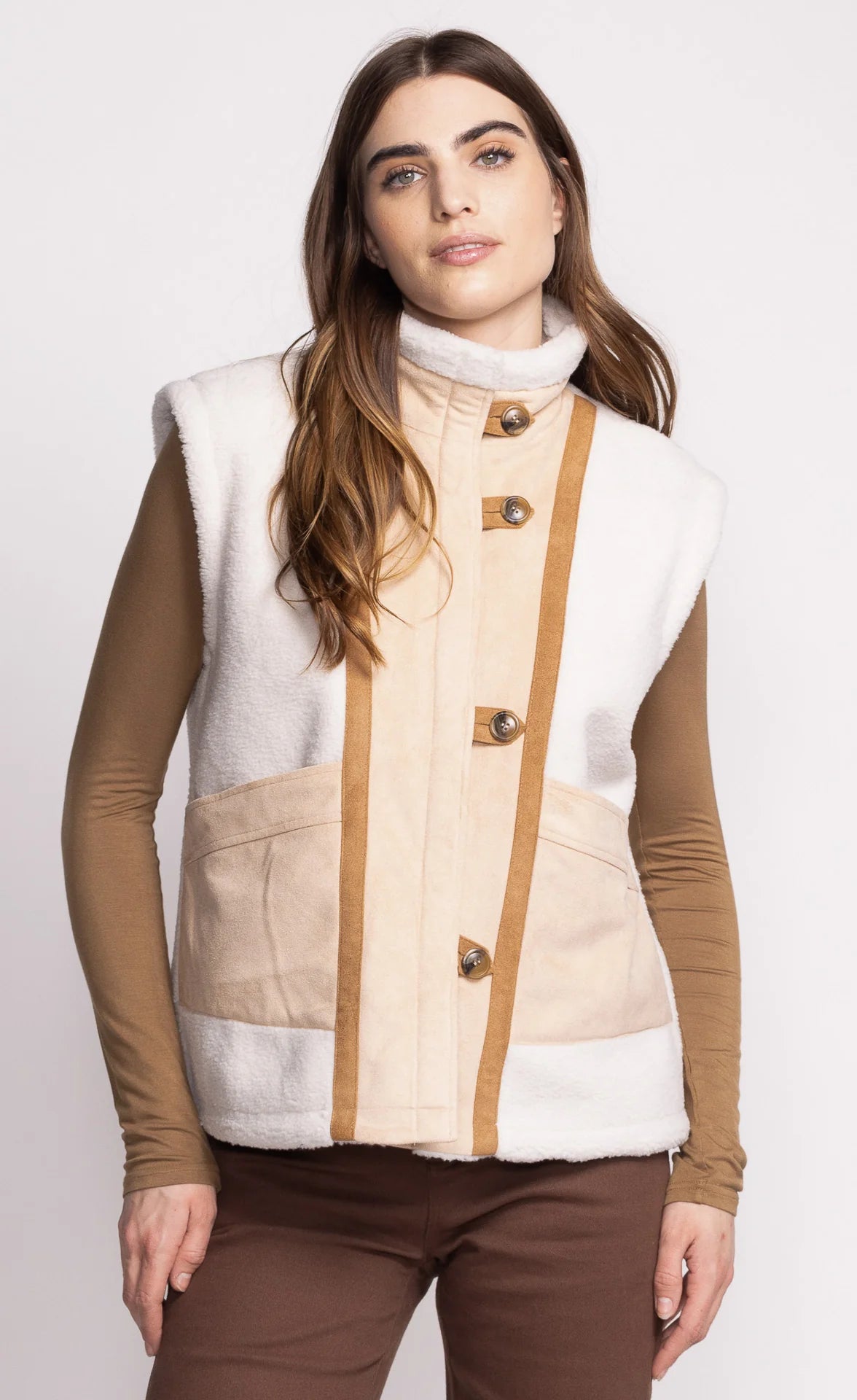 Meet your new favorite layering essential—The Ruby Fleece Vest in a gorgeous off-white with beige accents. This playful statement piece combines cozy fleece comfort with serious style credentials. Button up the front, rock that flattering high neck, and stash your phone in the front pockets. Whether you're running errands or elevating your everyday look, this versatile vest does the heavy lifting in the style department.