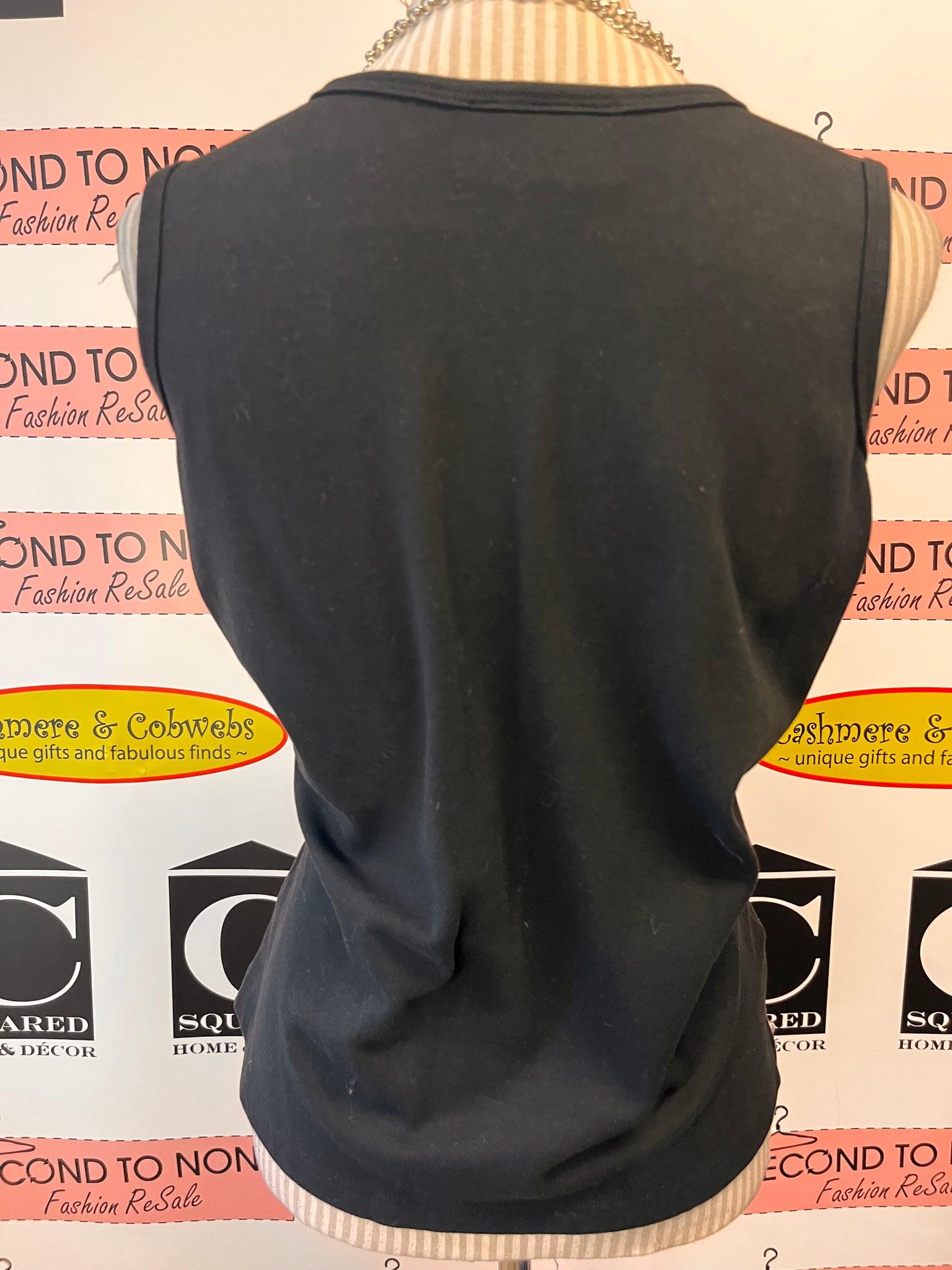 This black tank top is your new go-to for effortless style with serious sparkle. Crafted from a soft cotton and spandex blend, it features an elegant round neckline and wide shoulder straps that keep you comfortable all day long. The real magic? Intricate silver jewels arranged in delicate floral patterns that catch and shimmer with every movement, adding just the right amount of glamour to your everyday look. Thoughtful side slits prevent bunching while creating a flattering silhouette. Wear it solo for a statement piece or layer it under an open shirt for versatile styling that works from day to night. Size S.