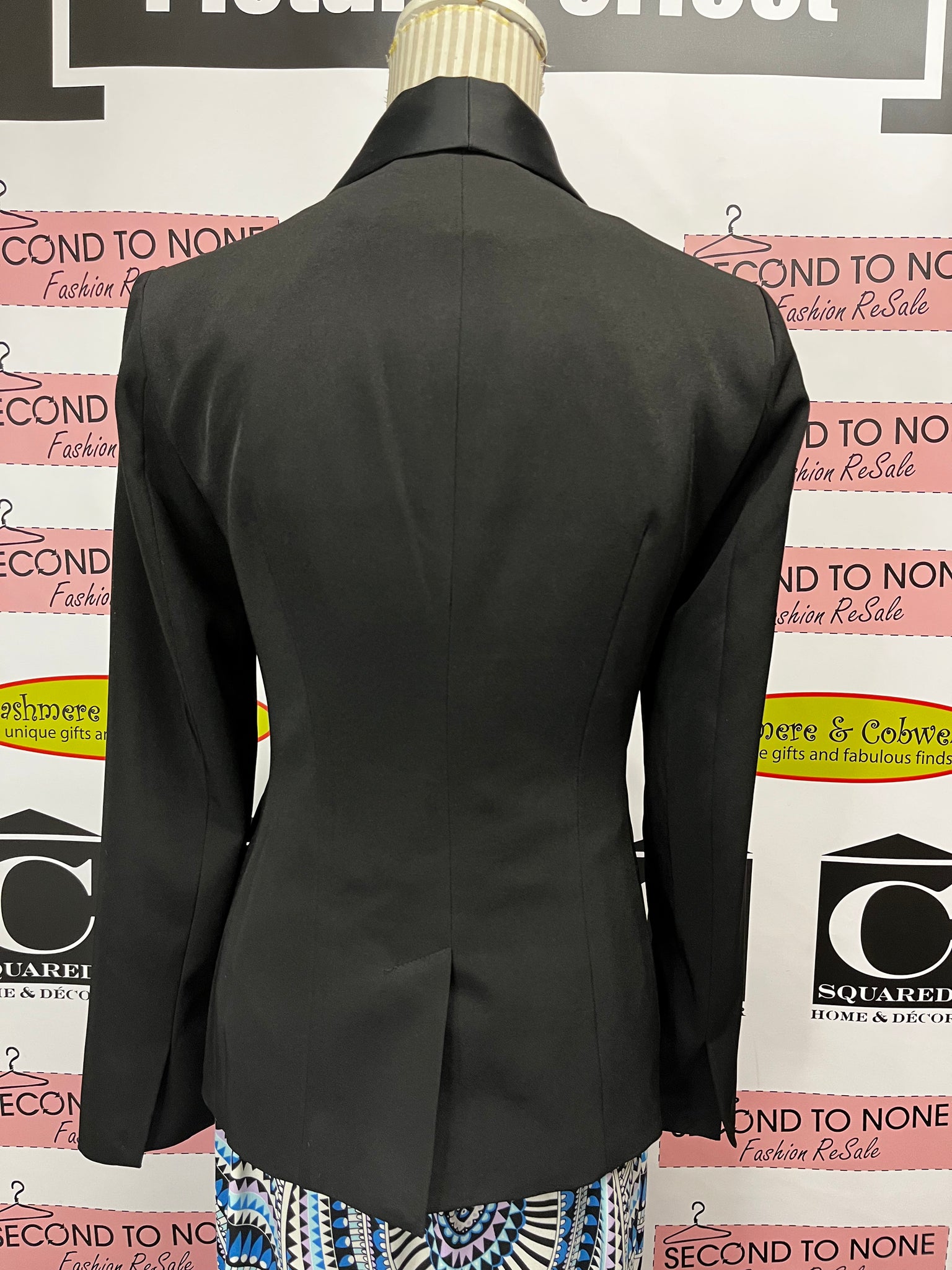 Elevate your wardrobe with this sleek Black Collection blazer—a one-button wonder that screams effortless sophistication. The luxe black satin trim adds just the right touch of polish without taking itself too seriously. Perfect for dressing up your everyday look or commanding the room at your next event. Timeless, tailored, and ready to become your new favorite layer.
