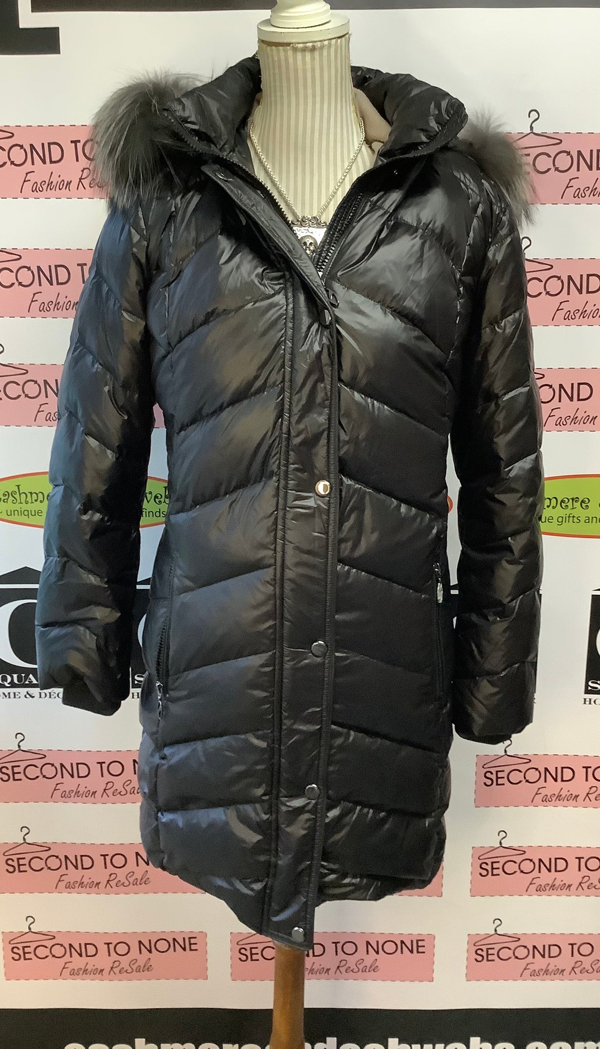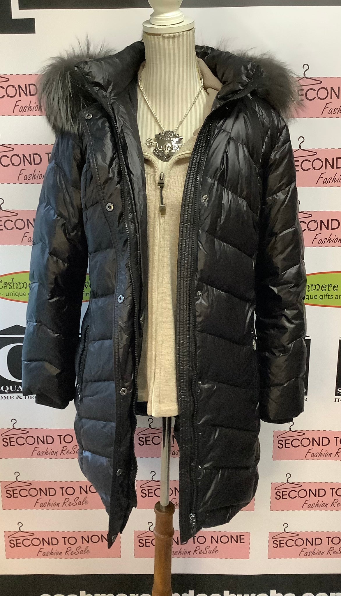Discover understated luxury with this maxi puffer coat, your answer to winter's demands. The striking black exterior pairs beautifully with a detachable faux fur-lined hood and extended sleeves for comprehensive warmth. Its full-length zipper grants you flexibility—fasten it completely for insulated protection or leave it open to layer effortlessly over your favorite pieces. Functional front pockets keep your hands warm and essentials secure. From crisp mornings to evening outings, this refined silhouette delivers the comfort and polish every discerning wardrobe requires during the colder months.