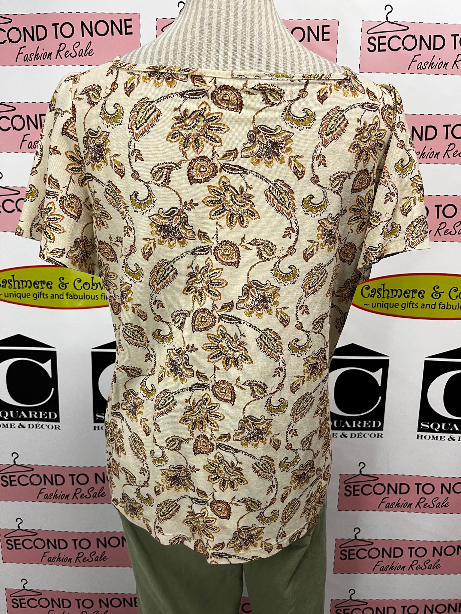 Effortlessly chic meets whimsical charm with this Cleo Button Front Tee. Featuring a gorgeous cream base adorned with warm brown and orange florals and paisley patterns, it's a print that practically dances off the fabric. The short sleeves keep things breezy, while the faux button-up front adds a touch of playful sophistication. Perfect for anyone who loves a little personality in their everyday wardrobe.