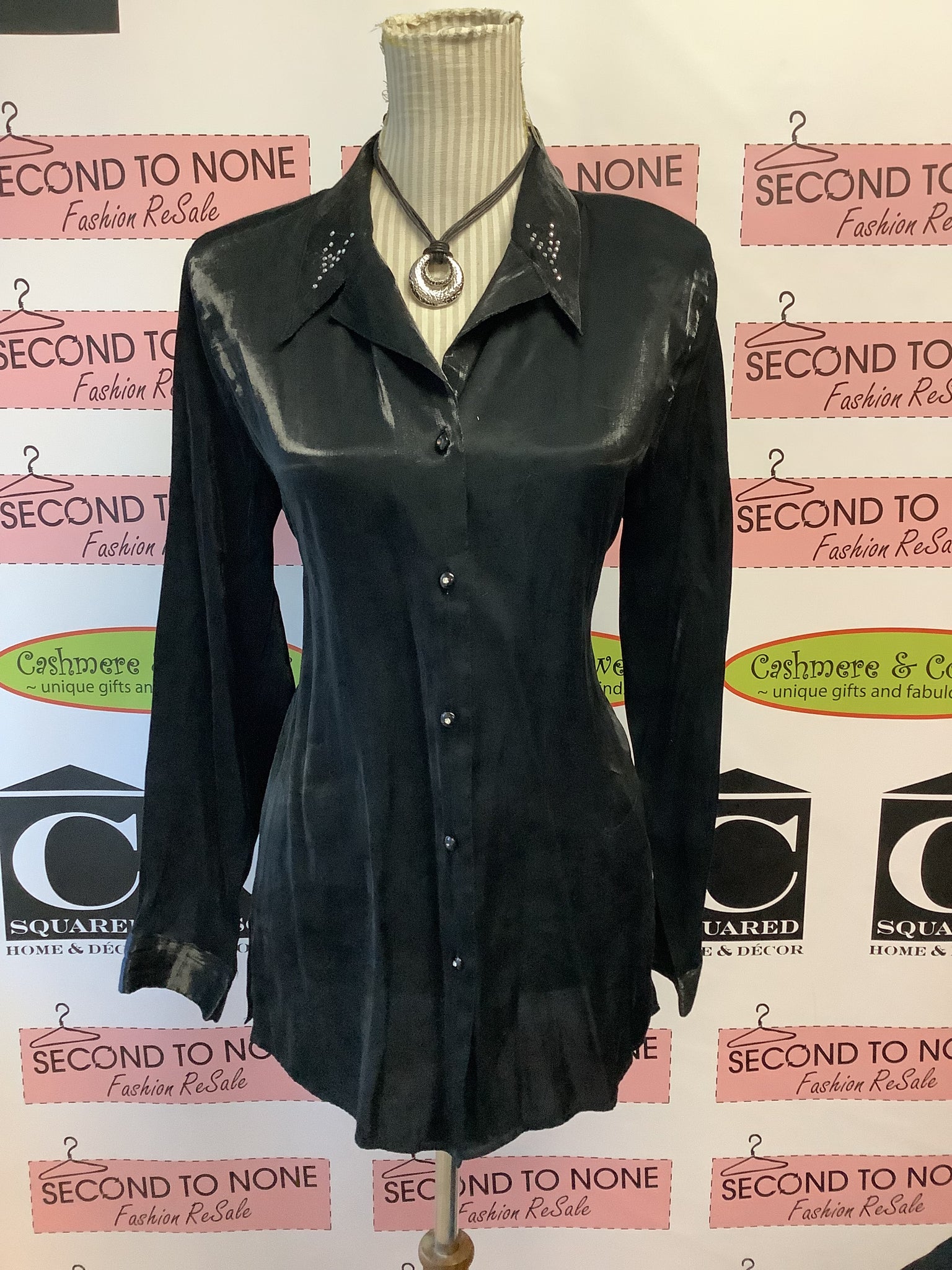 Elevate your evening wardrobe with this sophisticated sheer black blouse, designed to turn heads at your next celebration. Featuring delicate silver faux gems that catch the light beautifully, this collared piece offers versatile styling—wear it open over a cami for an effortlessly chic layered look, or button it closed for polished elegance. Perfect for New Year's Eve, cocktail parties, and special events, it pairs beautifully with leather leggings for an outfit that commands attention. The sheer fabric adds an air of refined glamour while maintaining a classy aesthetic that works for both dressy occasions and upscale gatherings.
