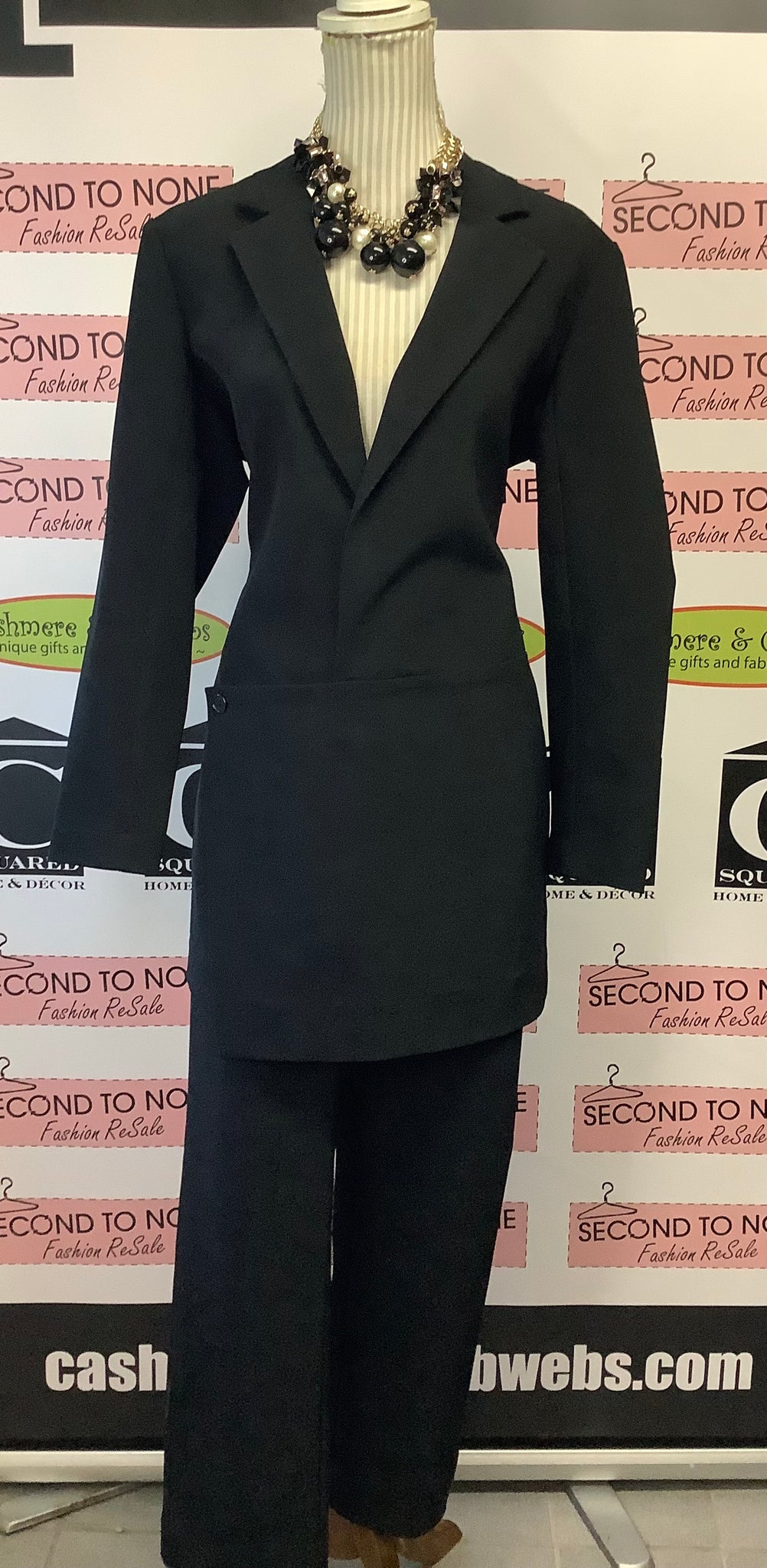 Command authority in this stunning two-piece black pant suit from Comrags. The surpliced blazer features a beautiful collar that frames the face beautifully, while straight-leg pants with secure clasp and zipper closure provide a polished silhouette. Layer a blouse underneath for added coverage and dimension. Impeccably maintained in perfect condition with no flaws. Pair with chunky jewellery to elevate your professional presence and exude quiet confidence in the boardroom or beyond.