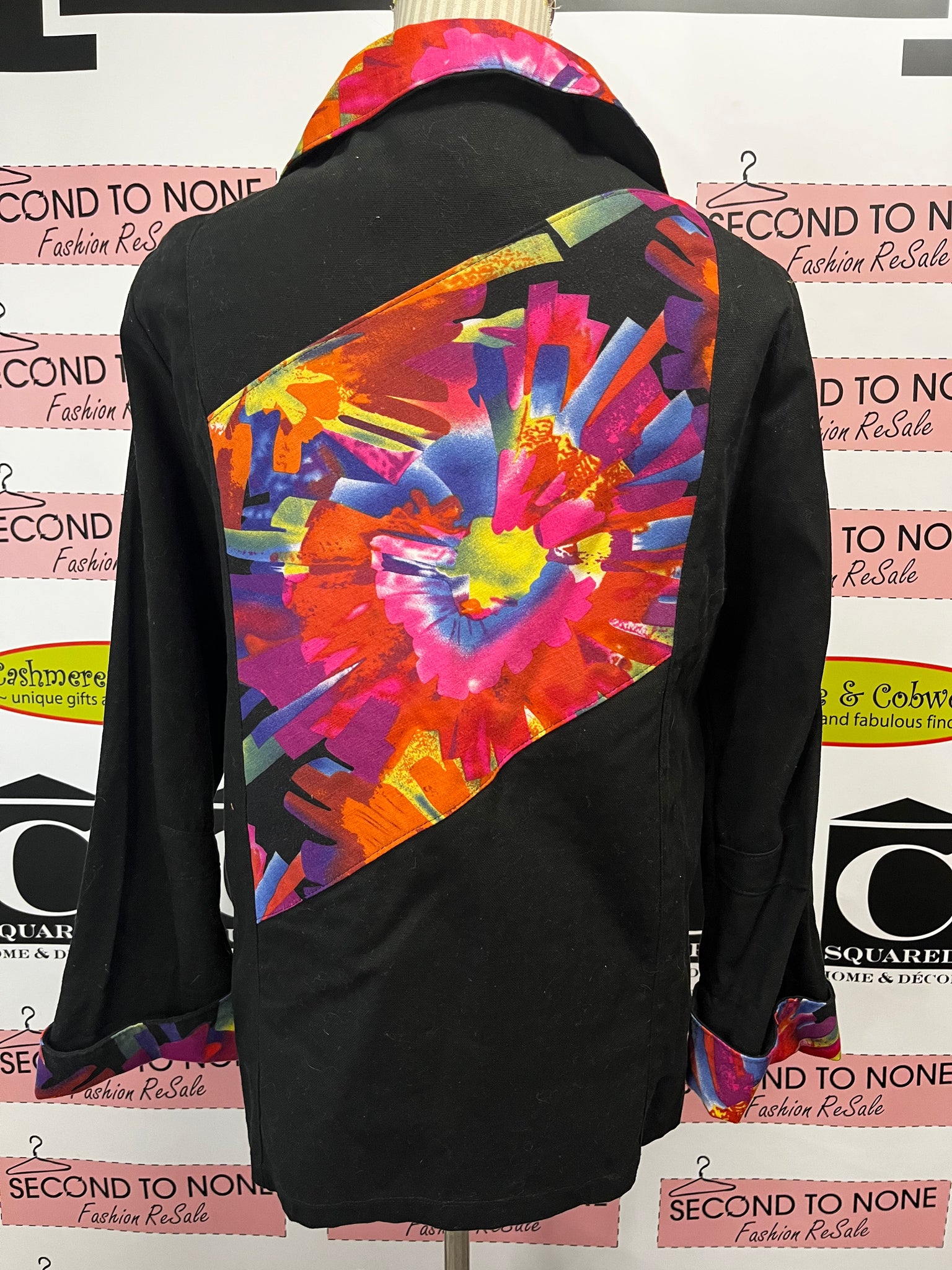 Step into sophistication with a twist! This striking black blazer features vibrant floral/tie dye accents that bring personality to your wardrobe. The open front design offers effortless layering, while handmade details add artisanal charm and uniqueness. Perfect for elevating everyday looks or making a statement at special occasions. A versatile piece that proves classic never goes out of style—especially when it's got a little botanical flair. Size not indicated but fits like a L.