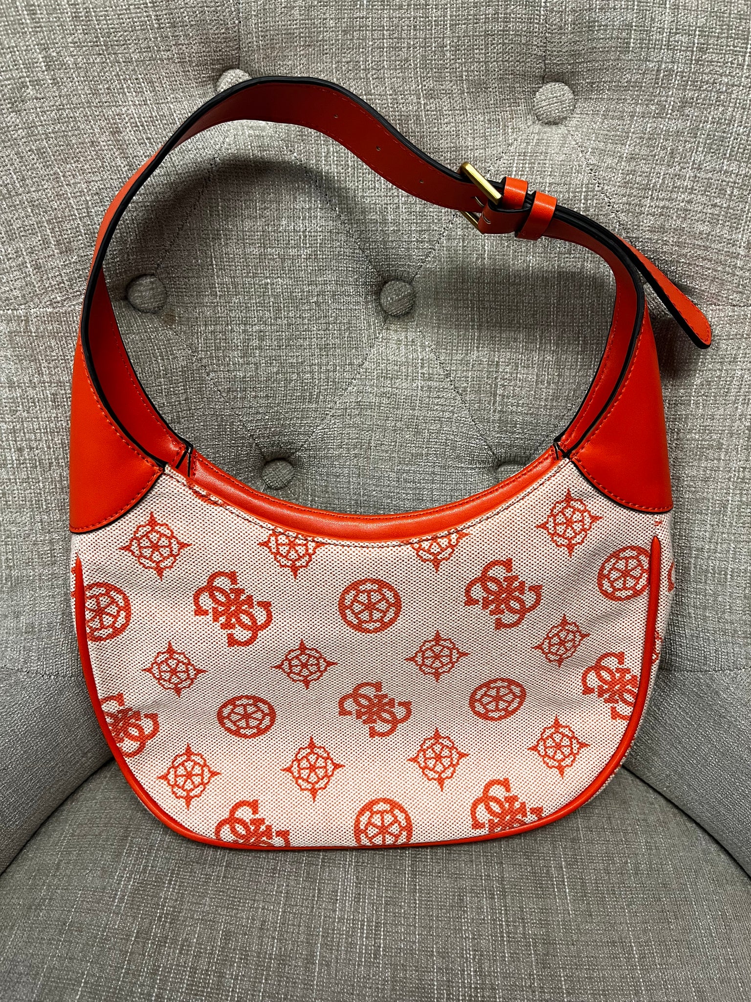 Make a splash with this Guess shoulder bag that pairs striking orange with clean white accents for maximum visual impact. The adjustable buckle strap adapts to your lifestyle—wear it however feels right. Designed with that coveted designer touch, this chic accessory brings personality and polish to your everyday carry. Whether you're heading to brunch or running errands, this playful piece proves that functional fashion can absolutely turn heads.