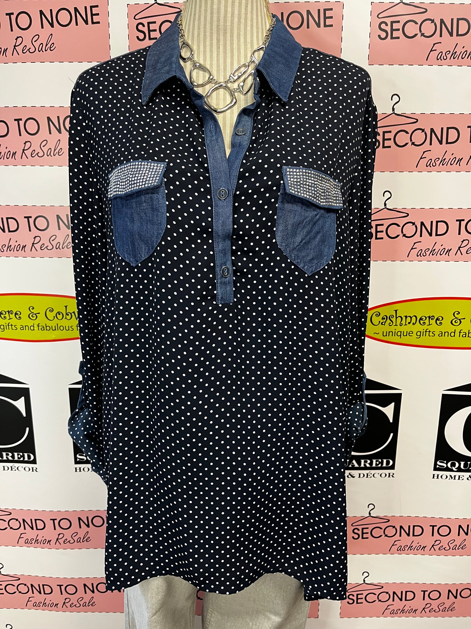Joseph Ribkoff Denim Polka Dot Top (Size XL)