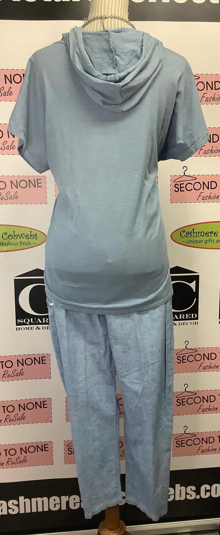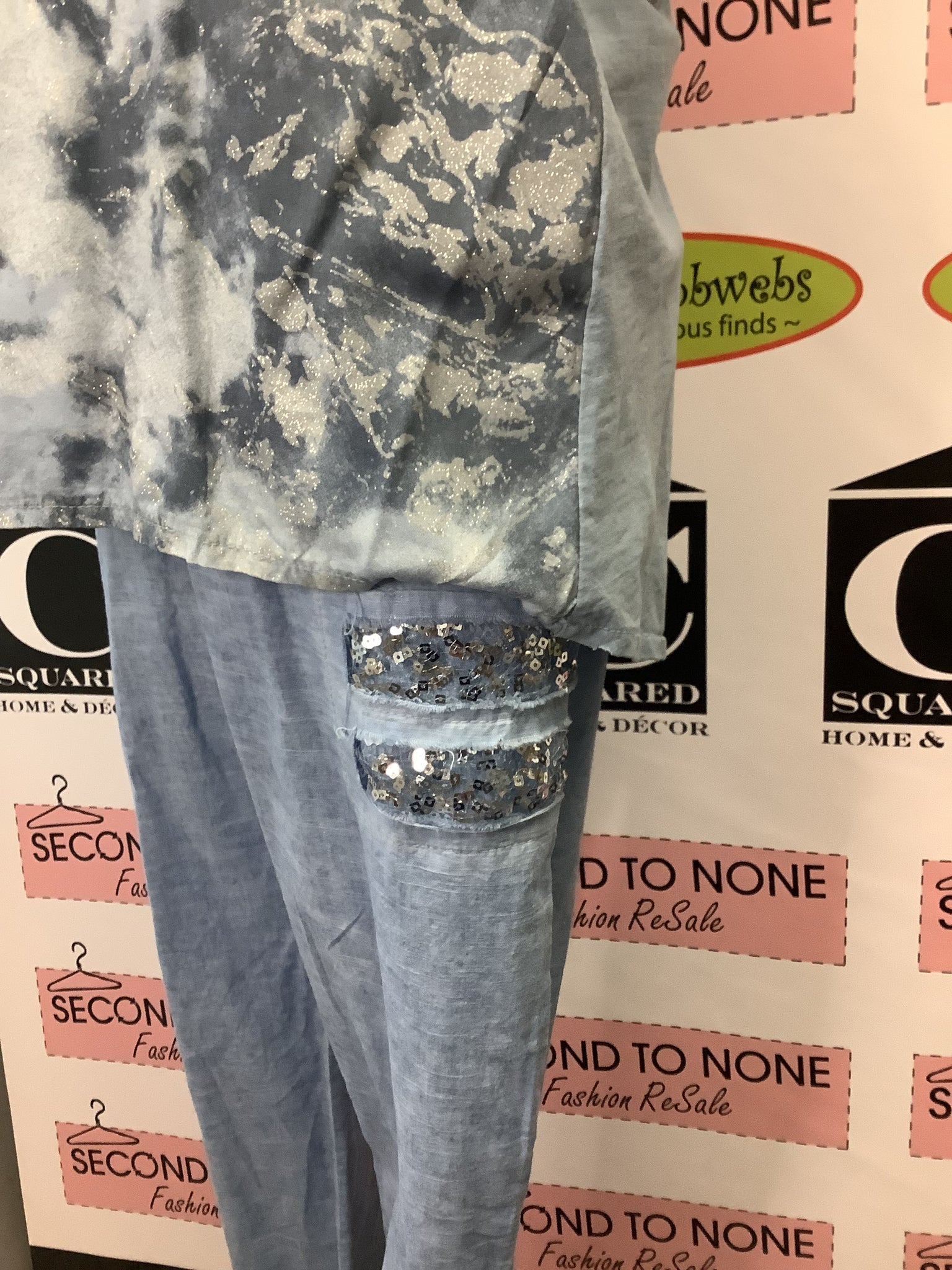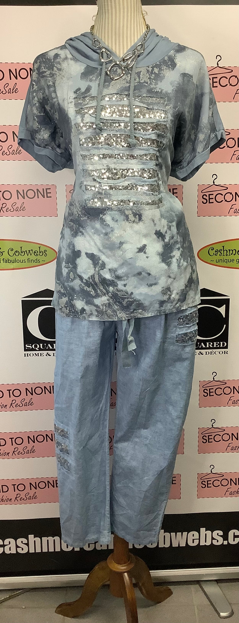 Elevate your winter wardrobe with this fashion-forward two-piece set that seamlessly blends comfort with contemporary style. The light wash blue drawstring pants feature a practical elastic waistband, functional pockets, and strategic faux slashes that reveal shimmering silver sequins for an unexpected sparkle. The sleeveless hoodie complements the look with its own sequin detailing, creating a cohesive, eye-catching ensemble. Perfect for those who refuse to compromise between cozy and glamorous, this set delivers cool-toned sophistication with an undeniably flashy edge. Versatile enough for casual outings or statement-making occasions, it's the ultimate piece for winter style that commands attention.