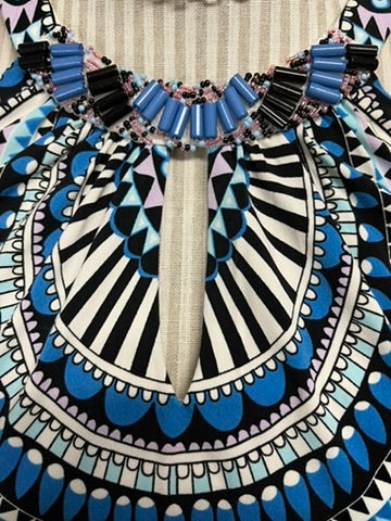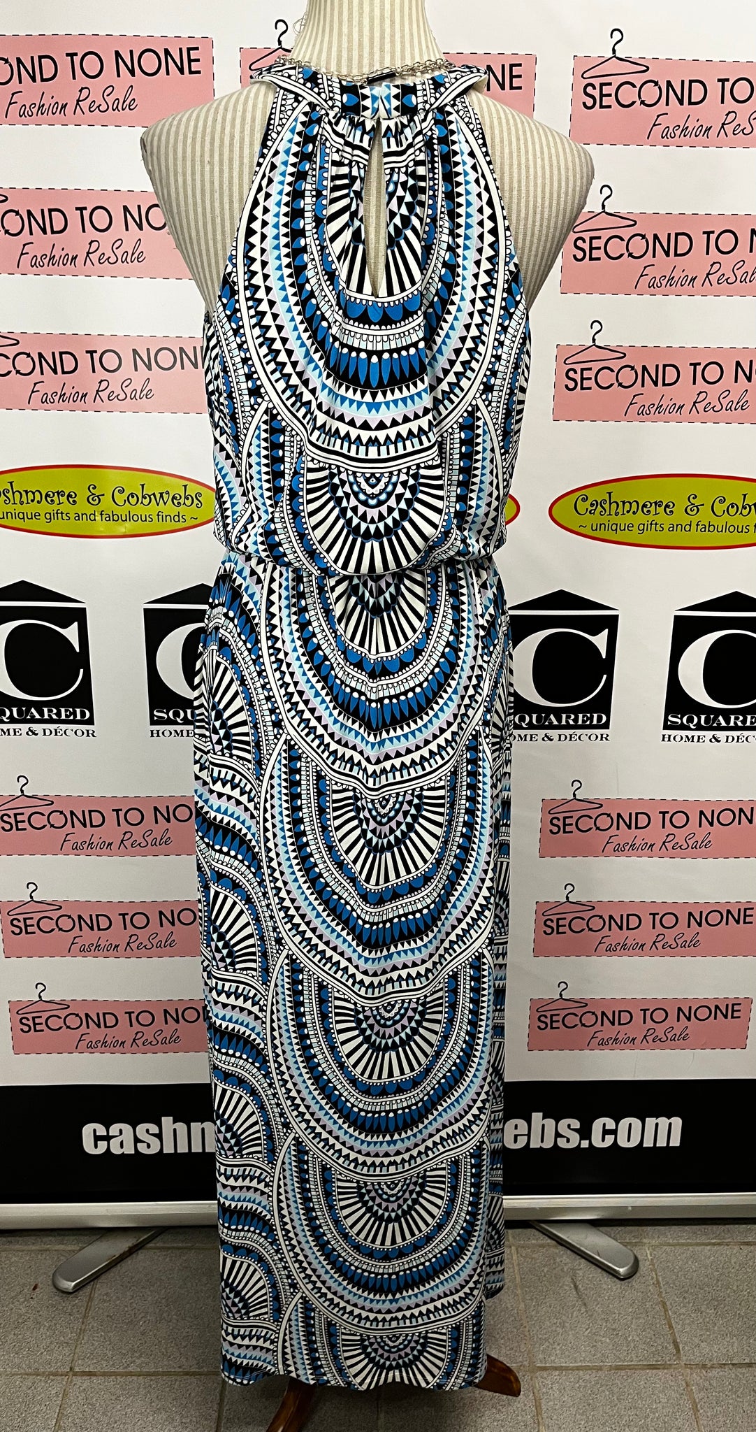 This stunning Maggie London maxi dress is an absolute showstopper! Featuring a chic geometric print in rich blues, purples, blacks, and whites, it's a design that commands attention. The sleeveless silhouette pairs beautifully with a sophisticated high neckline adorned with delicate beaded accents that catch the light with every movement. Perfect for elevating your evening look or making a bold statement at any special occasion, this dress combines modern style with timeless elegance. A true wardrobe treasure from the Melanie Lyne collection.