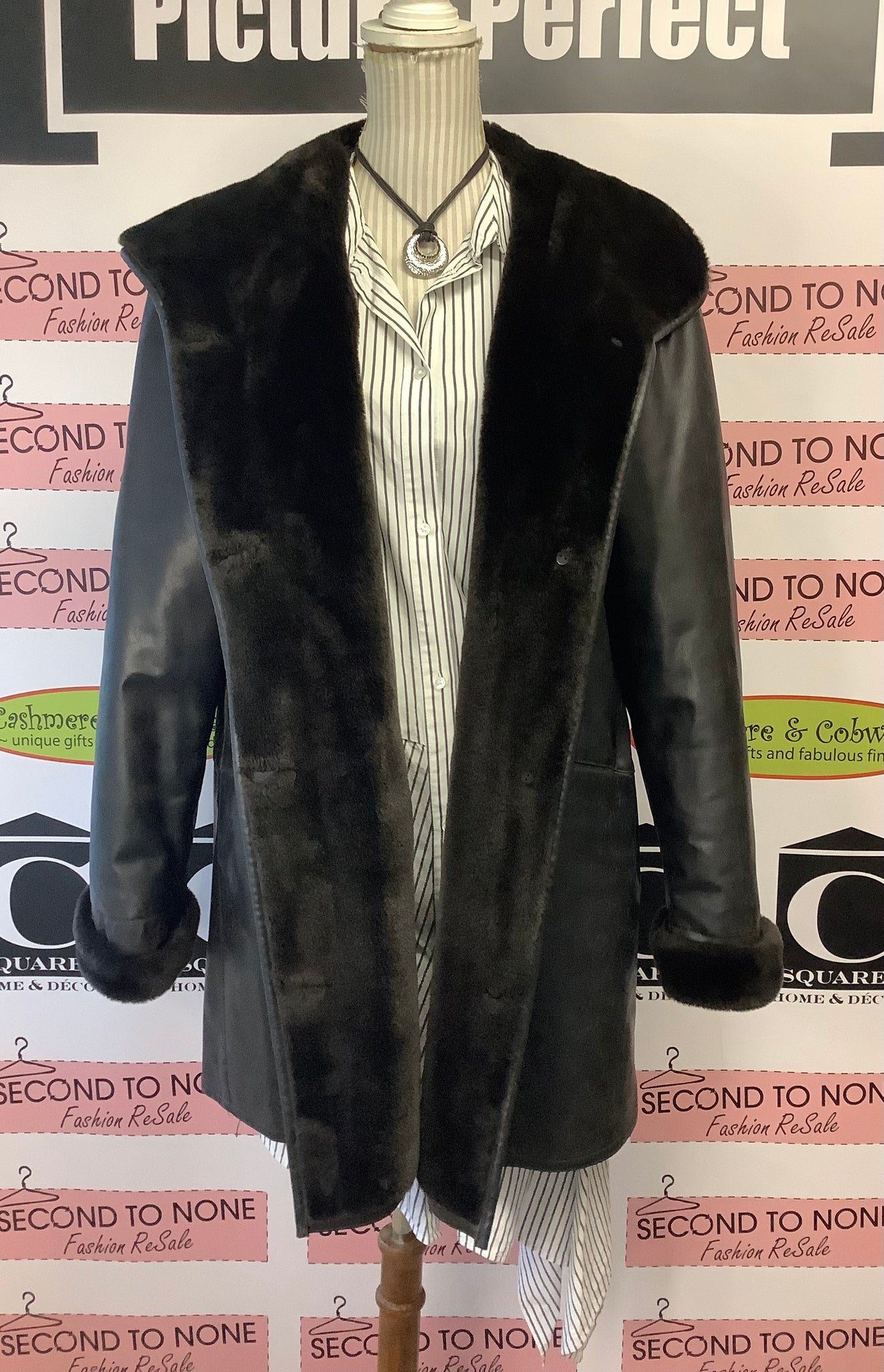 Embrace winter elegance with this luxurious brown leather coat, expertly crafted with sumptuous faux fur lining and cuffs for unparalleled warmth and texture. The substantial weight and generous length provide sophisticated layering, while practical front pockets and sleek black button detailing enhance both function and style. Impossibly soft and invitingly cozy, this statement piece transforms the coldest season into a fashion moment. Pair with a coordinating fuzzy hat and gloves to complete your winter wonderland aesthetic. A little bit of wear, but shows how much it was loved over the years!