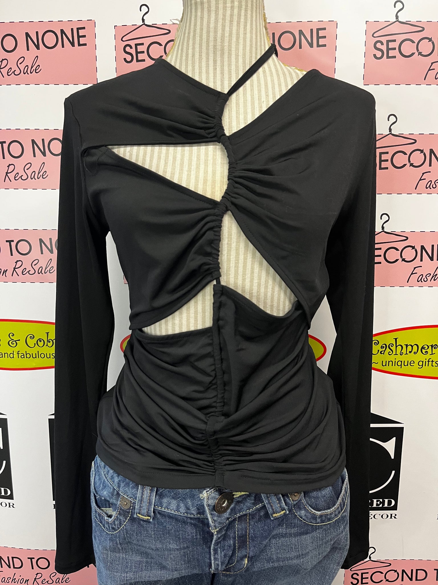 Elevate your wardrobe with this sultry H&M cutout top—a playful take on modern edge. Crafted from stretchy fabric that moves with you, this black long-sleeve piece features a daring front cutout that strikes the perfect balance between sexy and sophisticated. The fitted silhouette hugs in all the right places, making it ideal for nights out or turning heads at any occasion. Brand new with tags, it's ready to become your go-to chic essential.