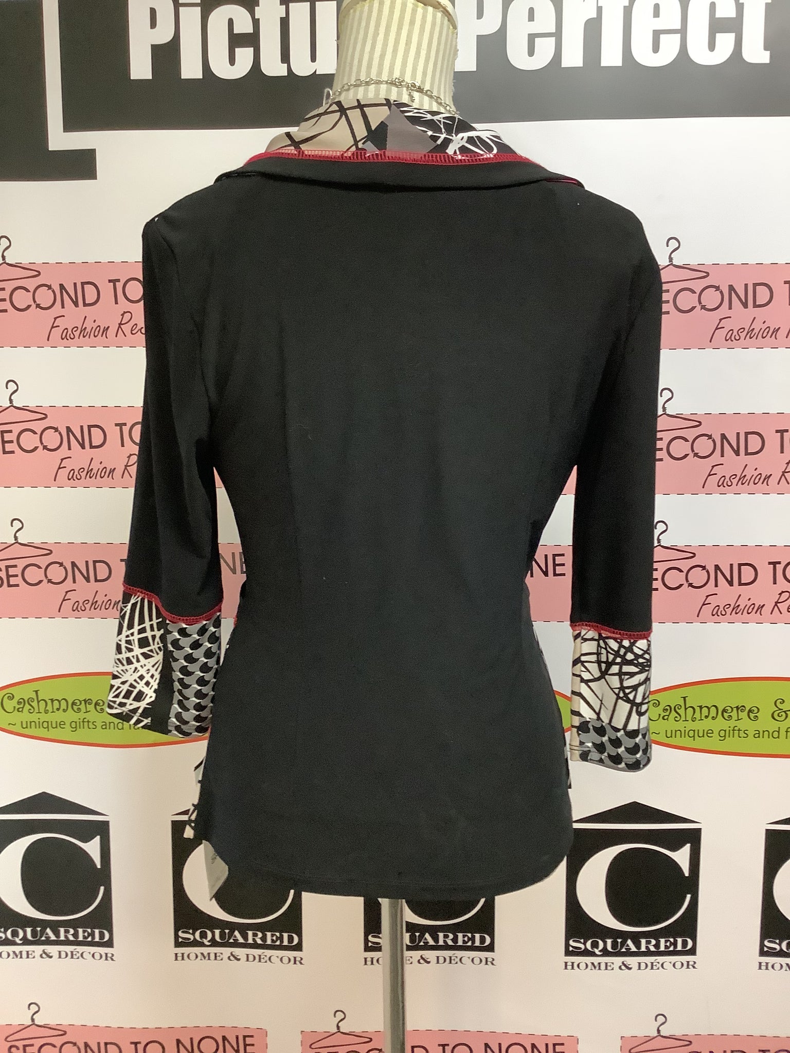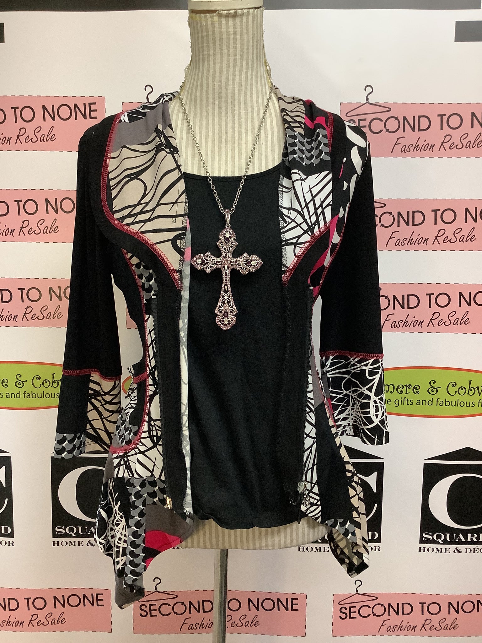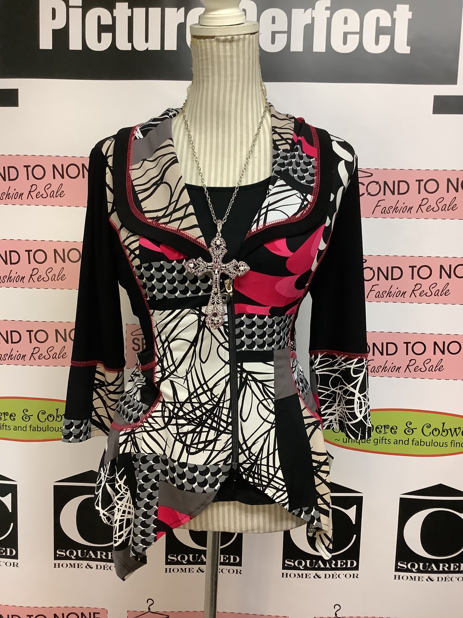 Elevate your layering game with this stunning Joseph Ribkoff cardigan, a designer piece that effortlessly transitions from season to season. Rendered in a sophisticated palette of pink, tan, white, and black, the abstract pattern adds visual intrigue to any ensemble. Crafted from lightweight fabric, this cardigan drapes beautifully whether worn open for a relaxed silhouette or closed with its sleek zipper enclosure. Practical front functional pockets make it as wearable as it is chic. Style it over leather leggings or tailored pants for an understated yet polished look. New with tags, this size 6 piece is a timeless investment from a celebrated brand.