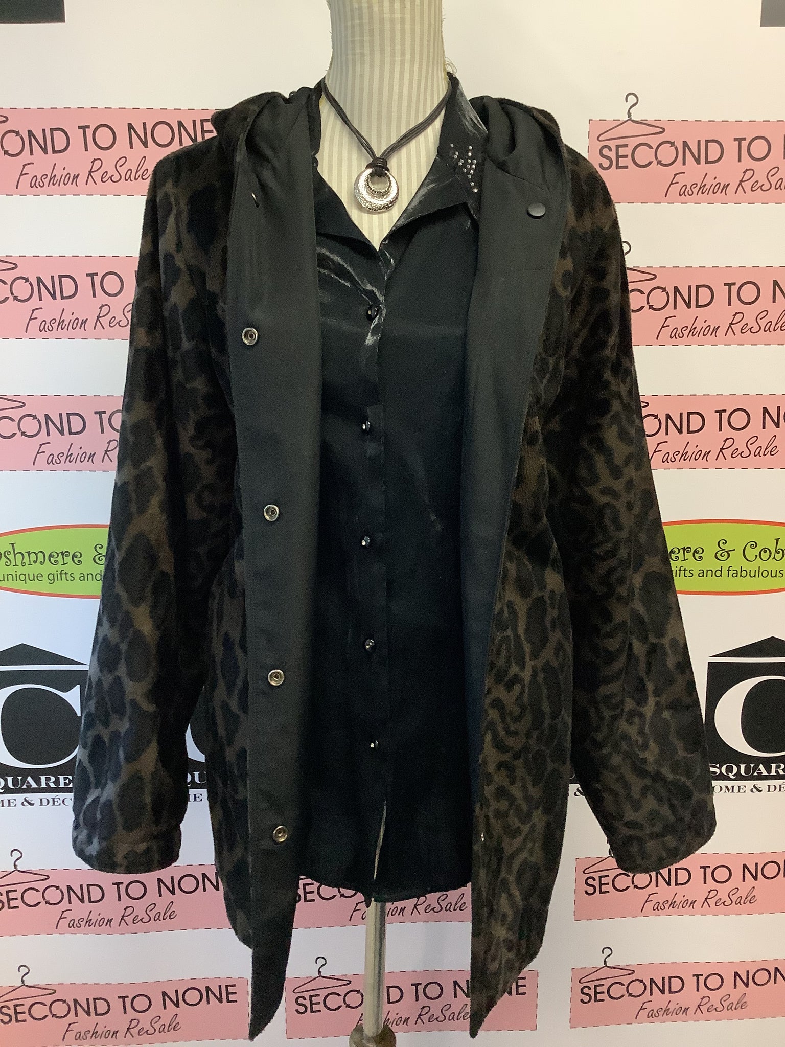 Elevate your outerwear collection with this sophisticated reversible coat that seamlessly transitions between two distinct aesthetics. One side features a sleek black finish, while the other showcases a luxurious fuzzy leopard print—giving you two versatile styles in a single piece. Weather-resistant fabric and a protective hood keep you comfortable through unpredictable conditions, while snap buttons and zippered pockets combine practicality with polished design. Perfect for urban exploration, this fashion-forward coat pairs beautifully with tailored gloves and a refined handbag for effortless city elegance.