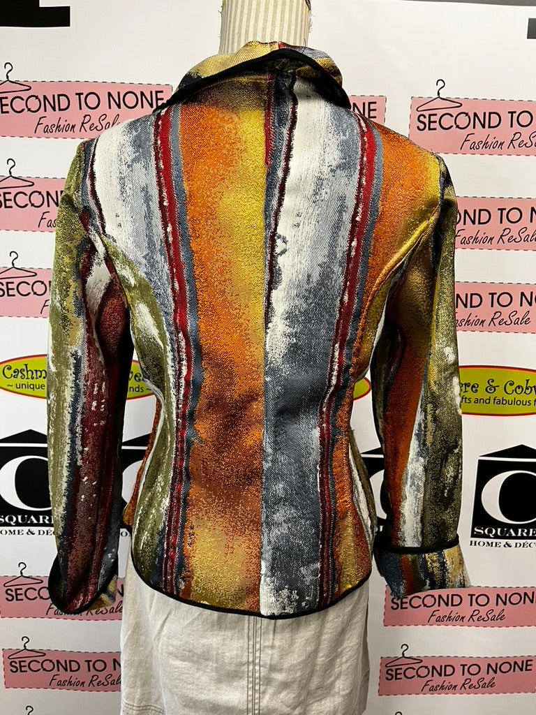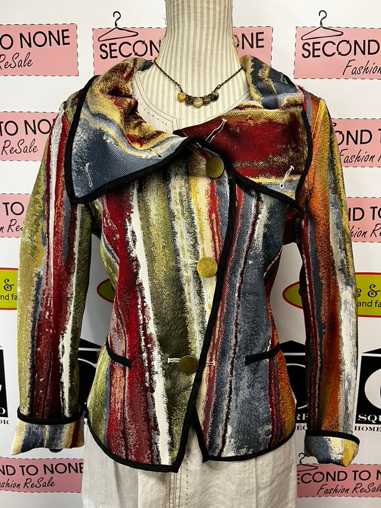 This striking tapestry jacket combines artisanal craftsmanship with contemporary versatility. The vibrant striped pattern draws inspiration from traditional textile design, while the button-up front offers effortless styling. What truly sets this piece apart is its reversible construction—wear it one way for a bold, saturated look, or flip it to reveal a similar aesthetic. The expert tailoring ensures a refined silhouette that works equally well layered over basics or worn as a statement piece. Perfect for those who appreciate distinctive design and value from their wardrobe investments. (Size not indicated but fits like a M)