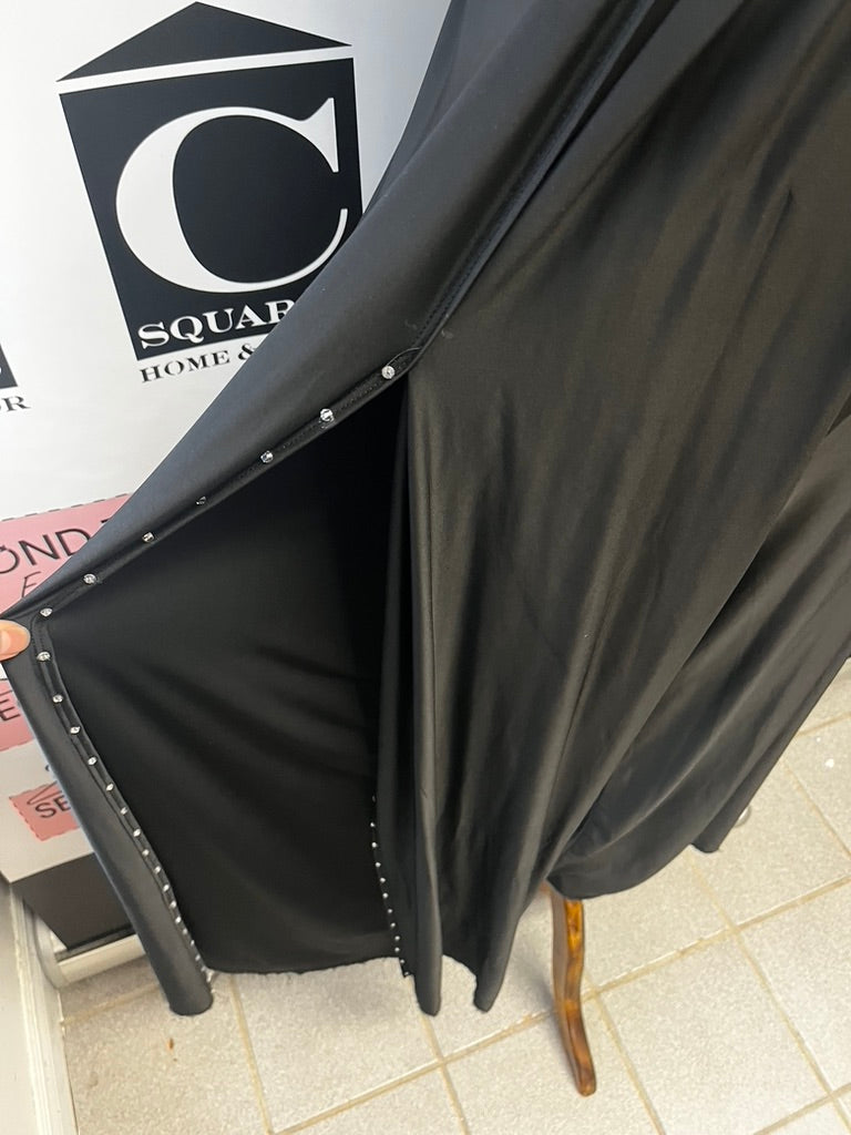 Make a statement in this show-stopping Seductions Bling Jumpsuit. Crafted in stretchy fabric with a daring deep V-neckline and sleeveless cut, it's designed for those who love to sparkle. Rhinestone details catch the light with every move, while strategic leg slits add an extra dose of sass. Perfect for nights when you want to turn heads and feel absolutely fabulous.