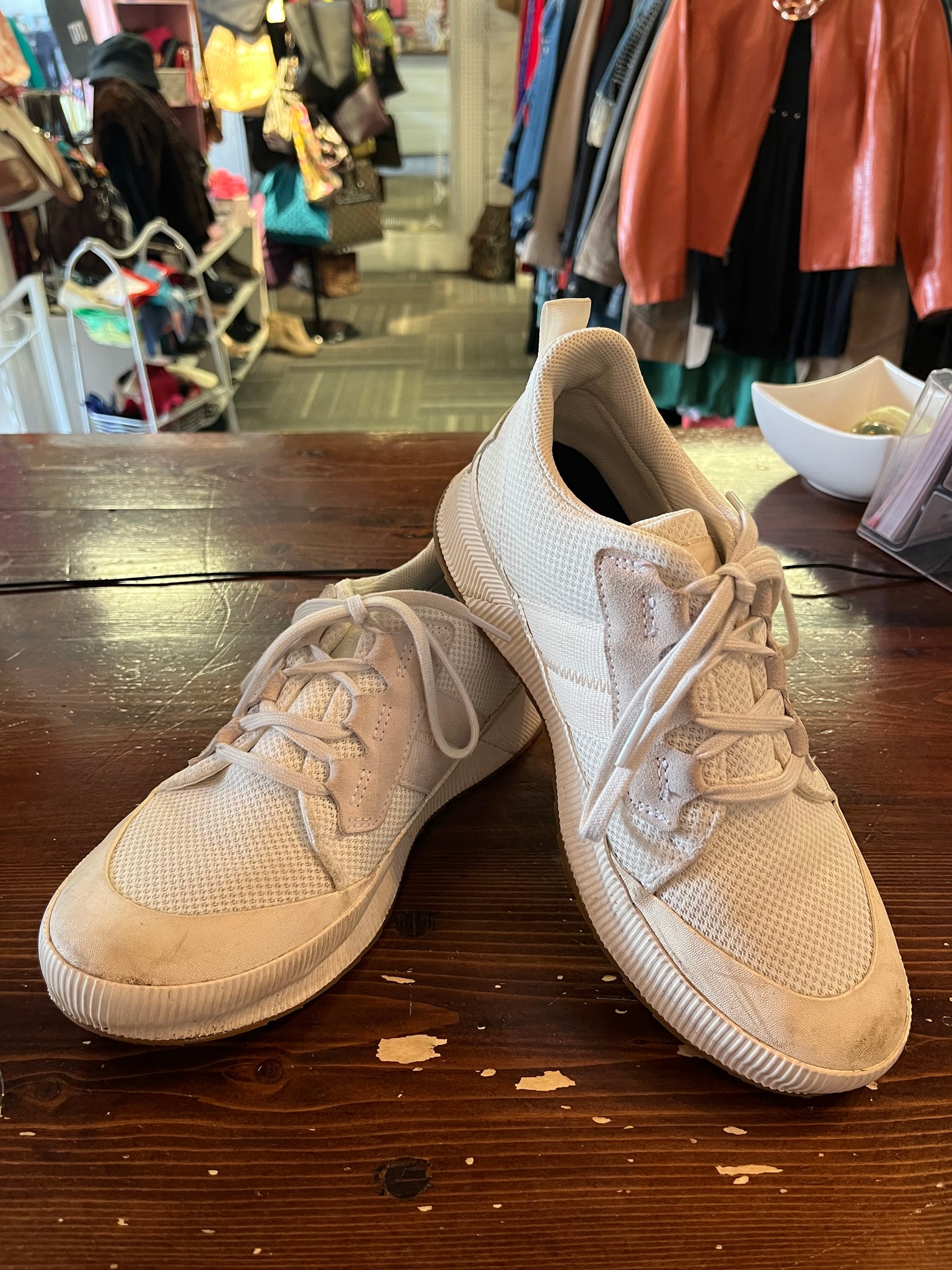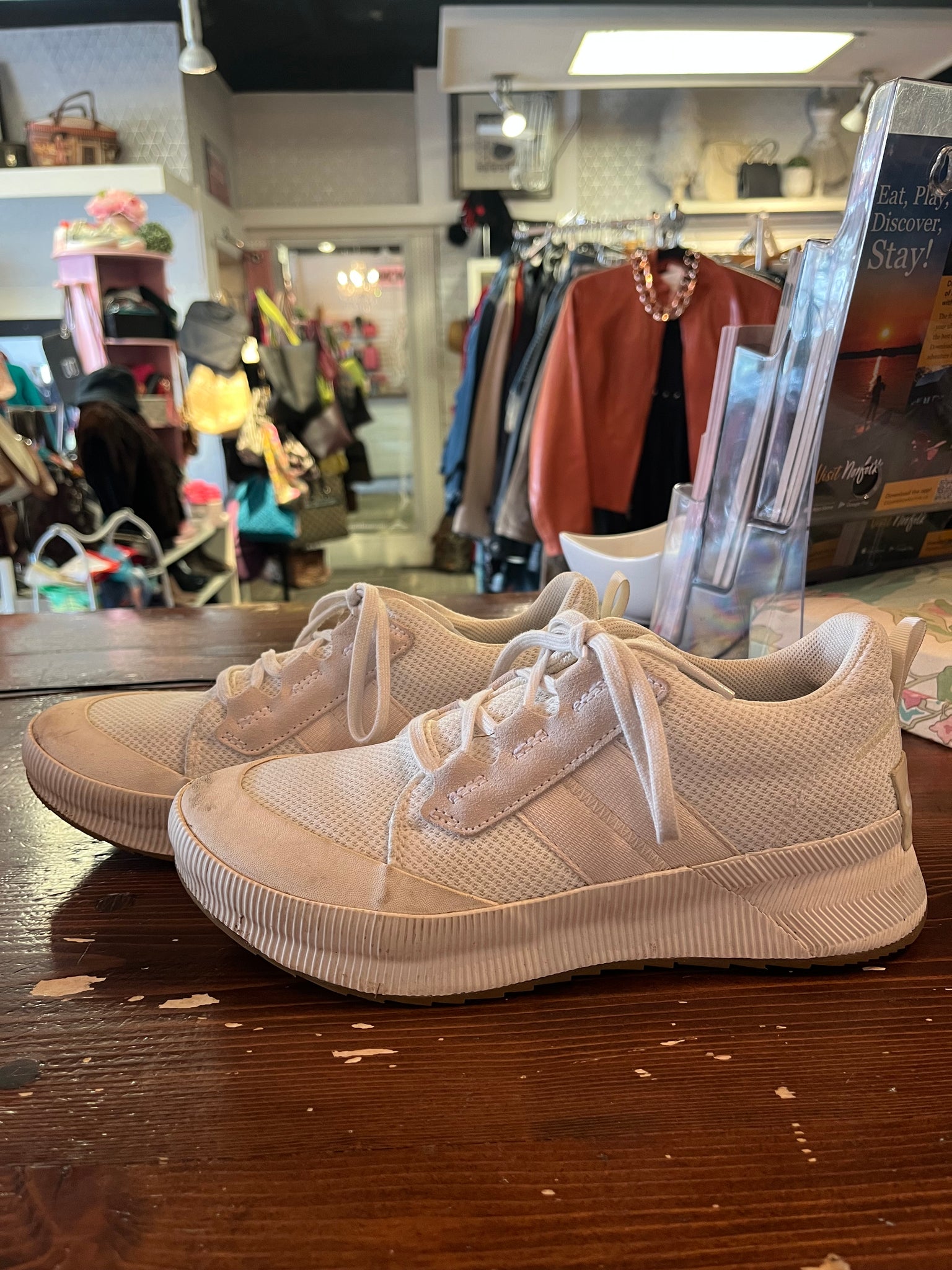 Engineered for wet-weather versatility, these handcrafted Sorel 'Out ‘N About' waterproof sneakers combine protective functionality with everyday wearability. The textile and suede upper features a reinforced waterproof toe cap and mesh construction to shed moisture while maintaining breathability. A cushioned footbed delivers all-day comfort for casual exploration, while the durable rubber outsole provides dependable grip on slick surfaces. The neutral white and off-white palette pairs effortlessly with any wardrobe, making these lace-up sneakers an essential choice for unpredictable weather and spontaneous adventures. Size 9.