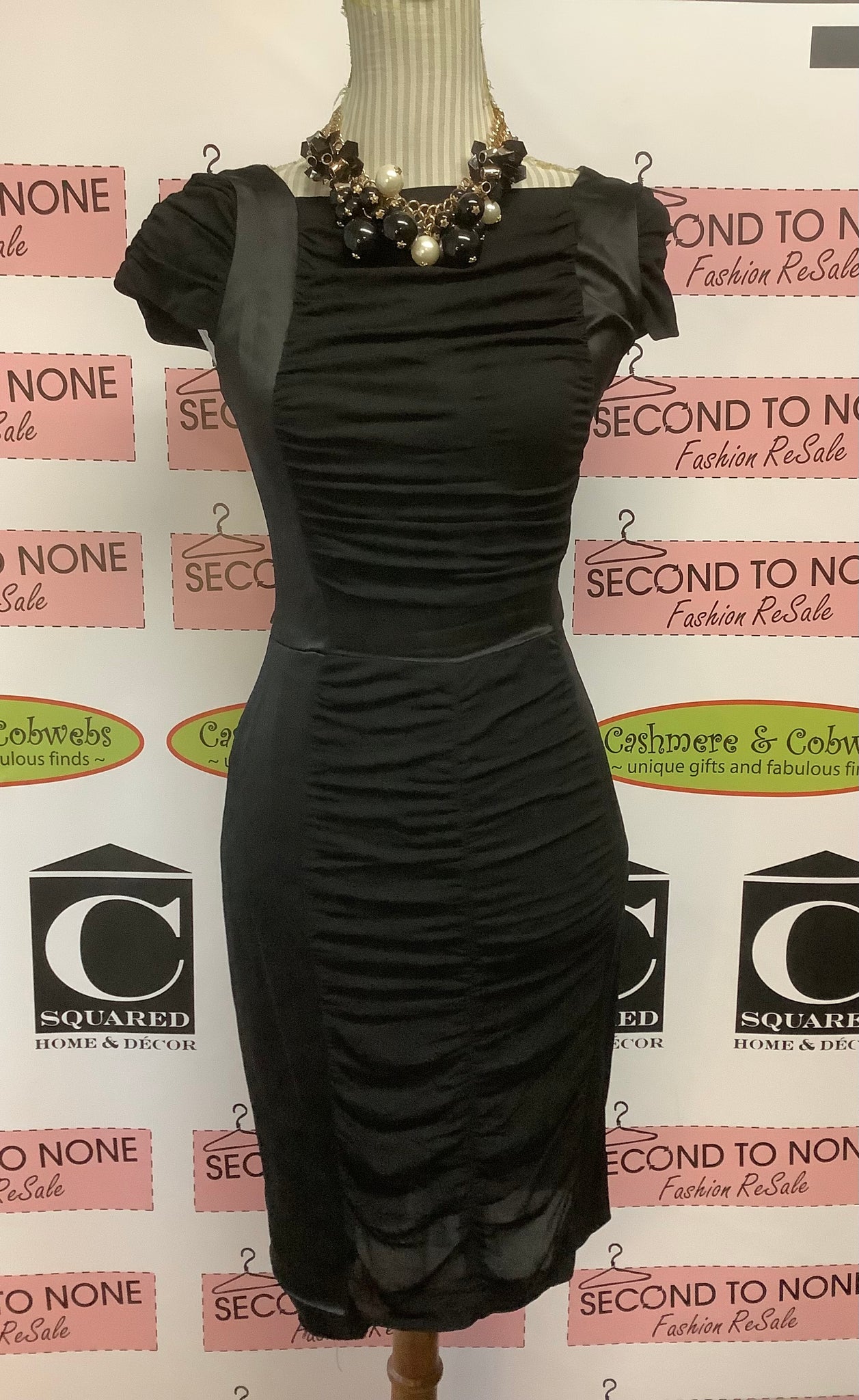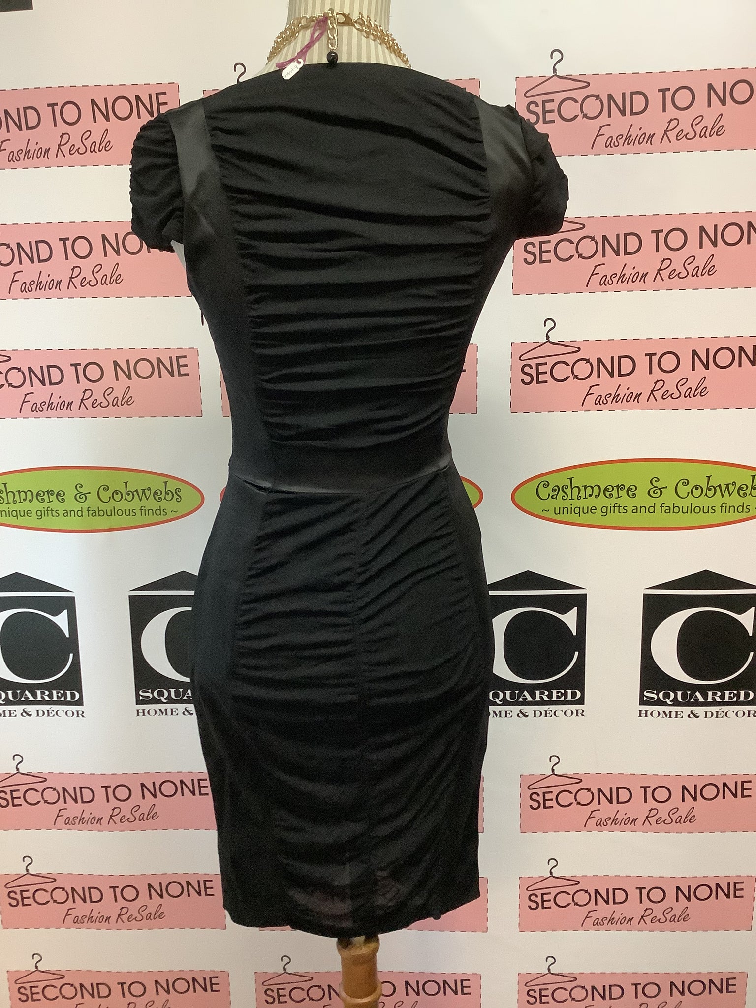 This sleek black cocktail dress features a flattering slimming silhouette with a fitted, smaller cut designed to enhance your frame. The elegant ruched front adds dimension and visual interest, while contrasting materials create a refined, modern aesthetic. Sleeveless and versatile, it transitions effortlessly from intimate gatherings to upscale events. Layer it with a structured trench coat for polished sophistication or drape a luxe fur stole for evening glamour. Perfect for cocktail parties, celebrations, and special occasions where understated elegance makes the strongest impression.