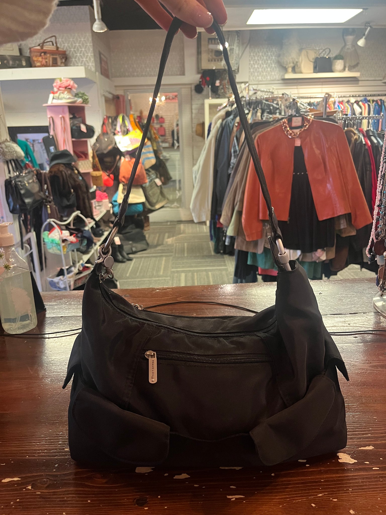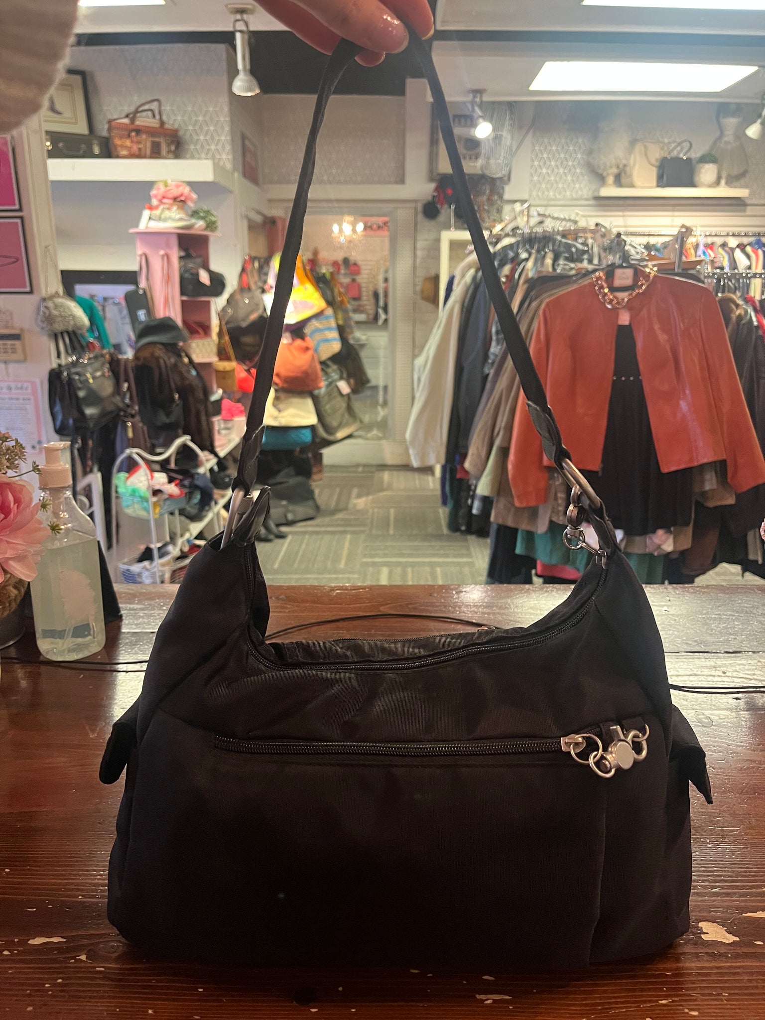 Travelon's Anti-Theft Shoulder Bag offers security and organization for everyday or travel use. With 4 snap closure pouch pockets, 3 zippered compartments, and patented Anti-Theft technology, it protects your belongings from pickpockets. Locking clasps on 2 compartments keep hands off, and a carabiner on the strap to allow you to secure the bag to something else. Complete with a small LED flashlight inside and silver hardware to provide added safety and style.