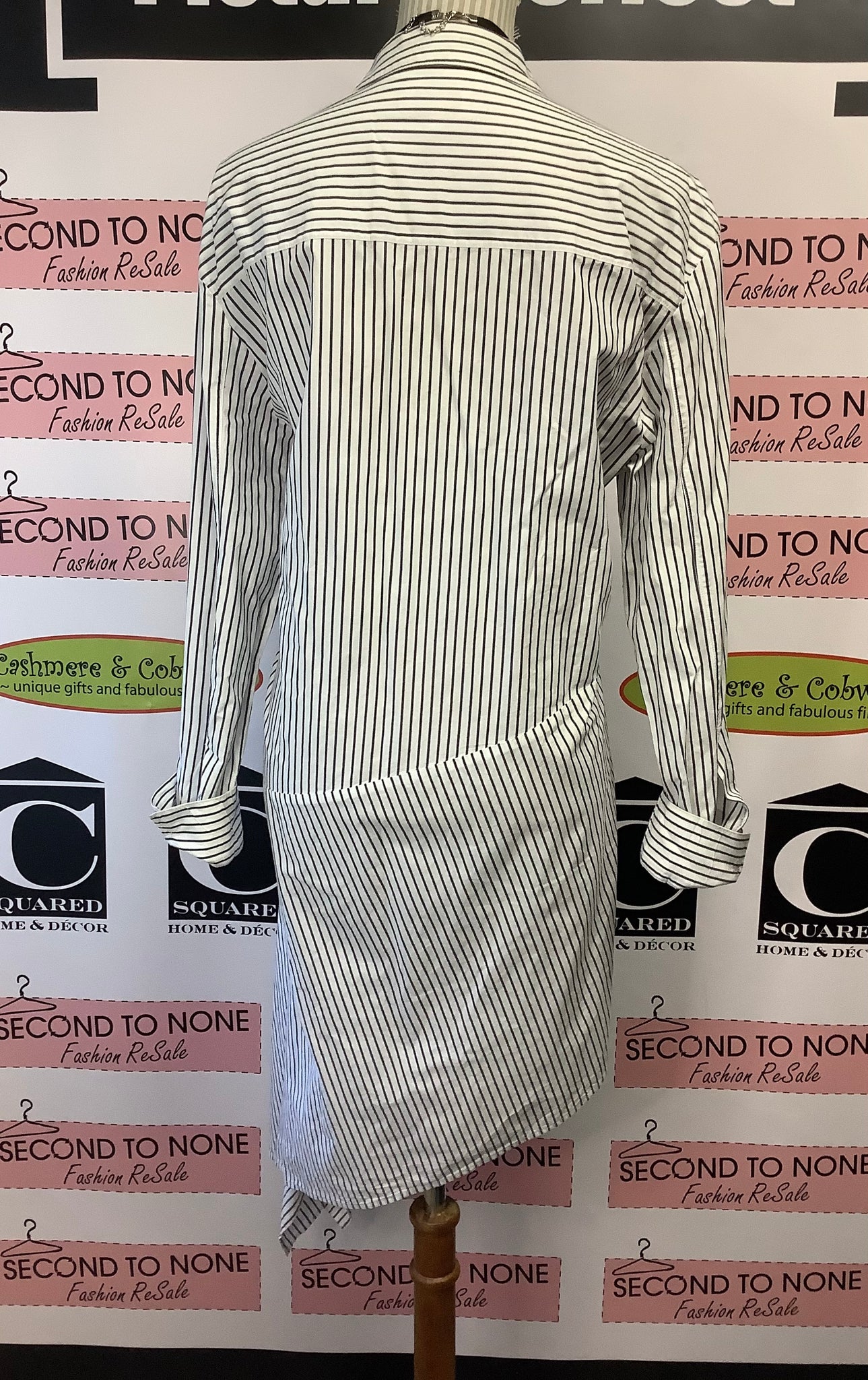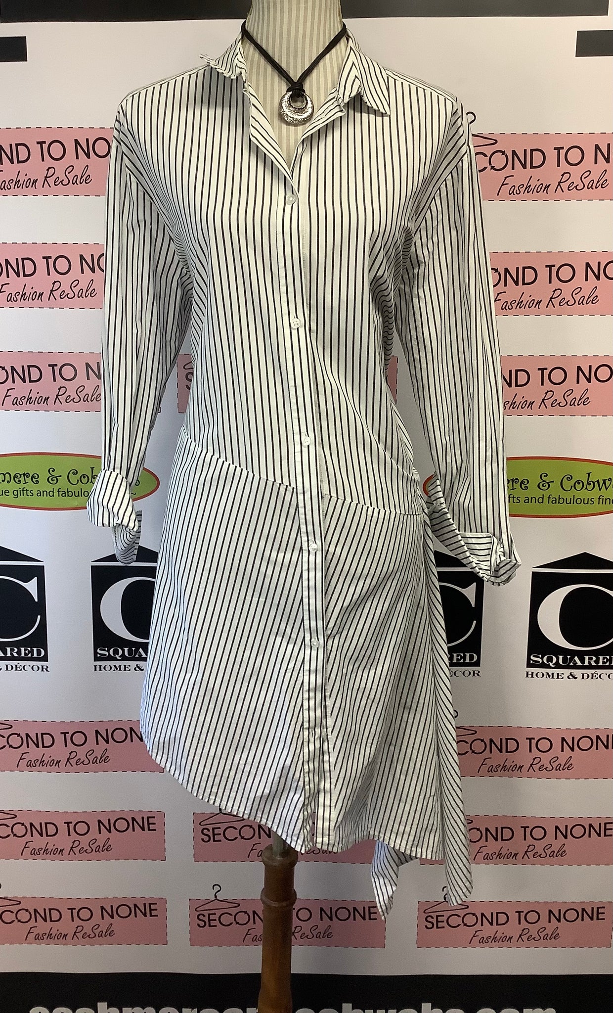Elevate your casual wardrobe with this fashion-forward tunic featuring a striking black and white striped pattern and an asymmetrical silhouette. The crisp collar, long sleeves with adjustable roll-up cuffs, and delicate white button detailing create an effortlessly polished look. Versatile and chic, it pairs beautifully with leggings or tights for layered elegance, or layer beneath a winter coat for added dimension. A modern essential that transitions seamlessly from weekday to weekend.