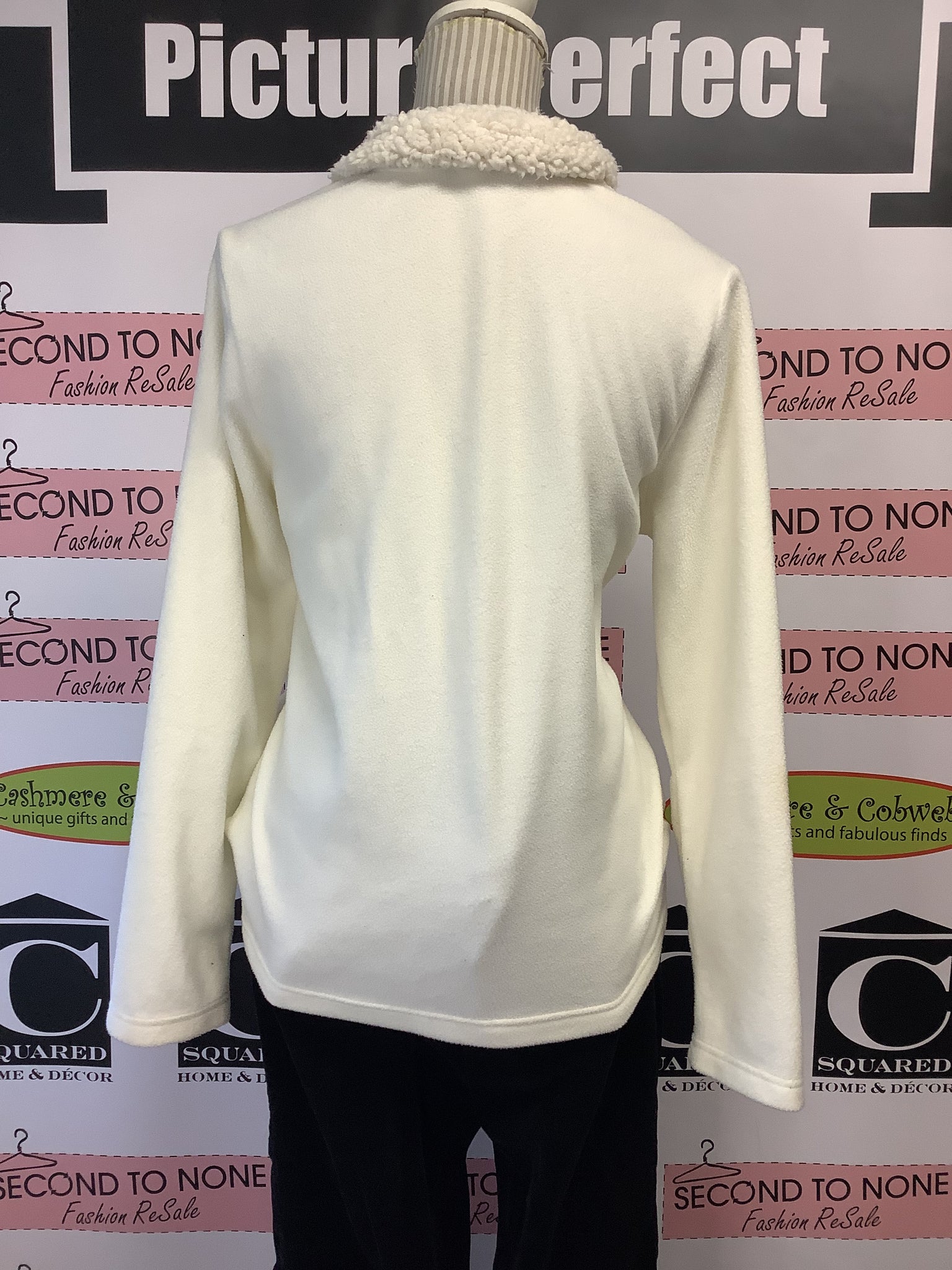 Embrace the season in this elegant off-white zip-up sweater, adorned with graceful red cardinals perched among delicate tree branches. Crafted for warmth and comfort, the fuzzy fabric and sherpa-lined collar provide the perfect cocoon against winter's chill. A charming snowflake zipper pull adds a festive finishing touch. Layer effortlessly over cute jeans for a polished holiday look, or slip on with your favorite hot cocoa for an evening of pure coziness. This sophisticated piece captures the essence of winter elegance while keeping you wonderfully warm.