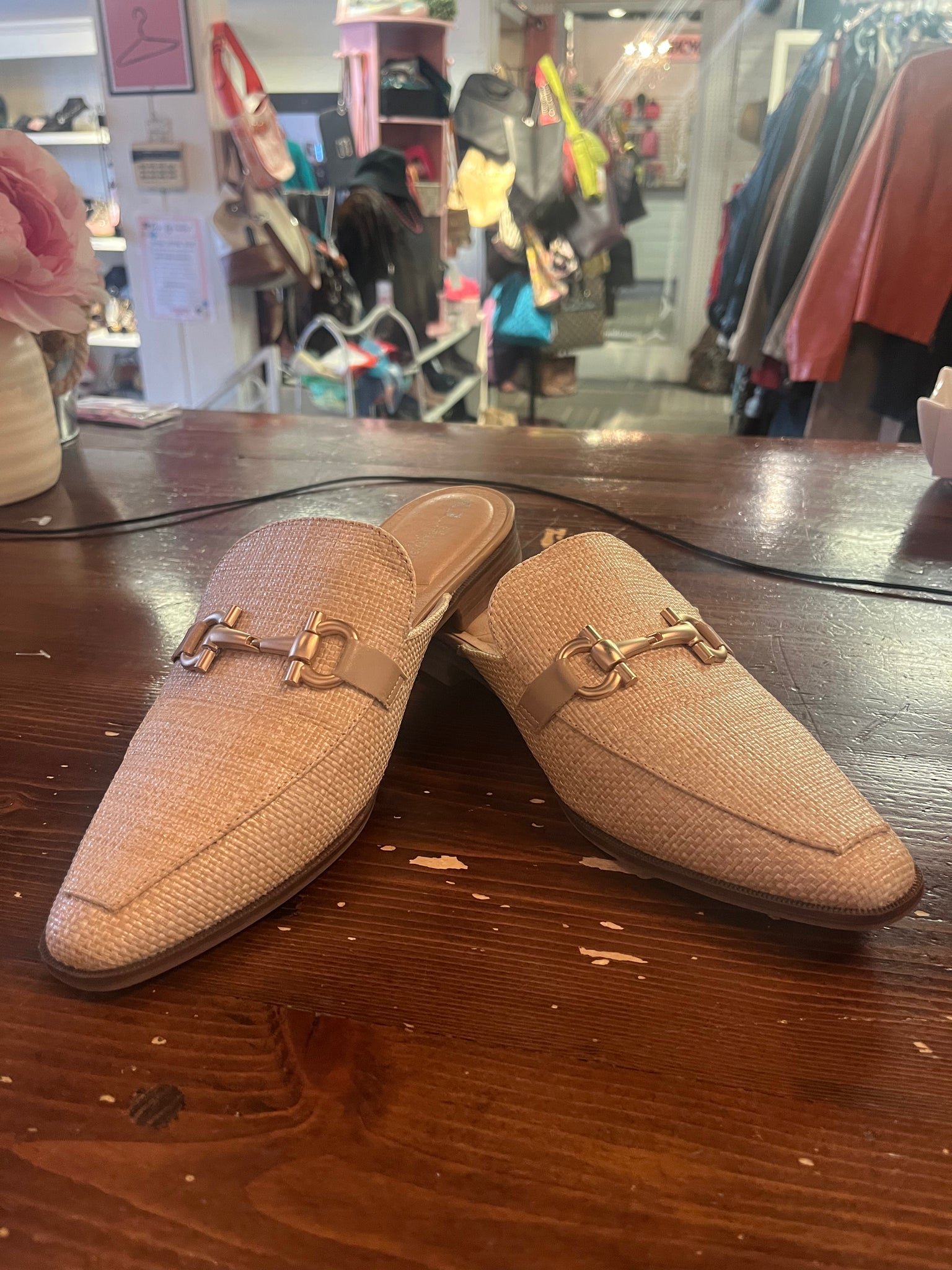 Introducing our Woven Loafer Mules, brand new and never worn! Slip on and off with ease while enjoying the comfort of the cushioned footbed. The gold buckle and woven light beige upper add an elegant touch to any outfit. The tapered squared toe, 1 inch heel, and wood-like sole complete the classy look. Look expensive and chic without sacrificing comfort! Brand: CL by Laundry. Size 9.5.