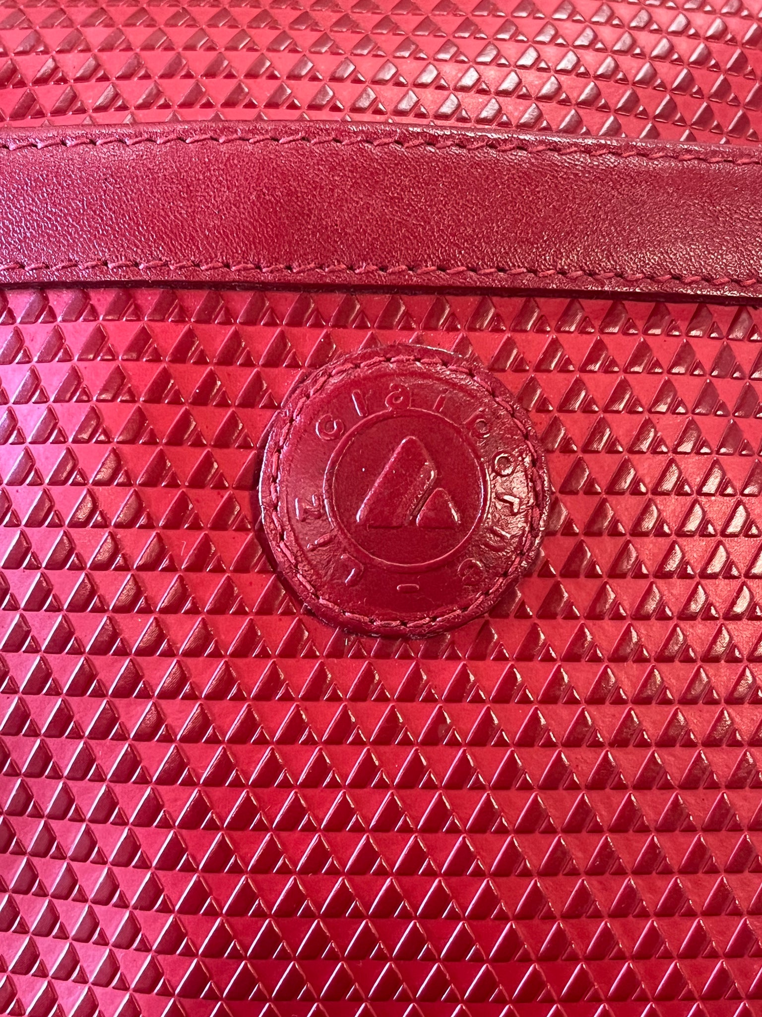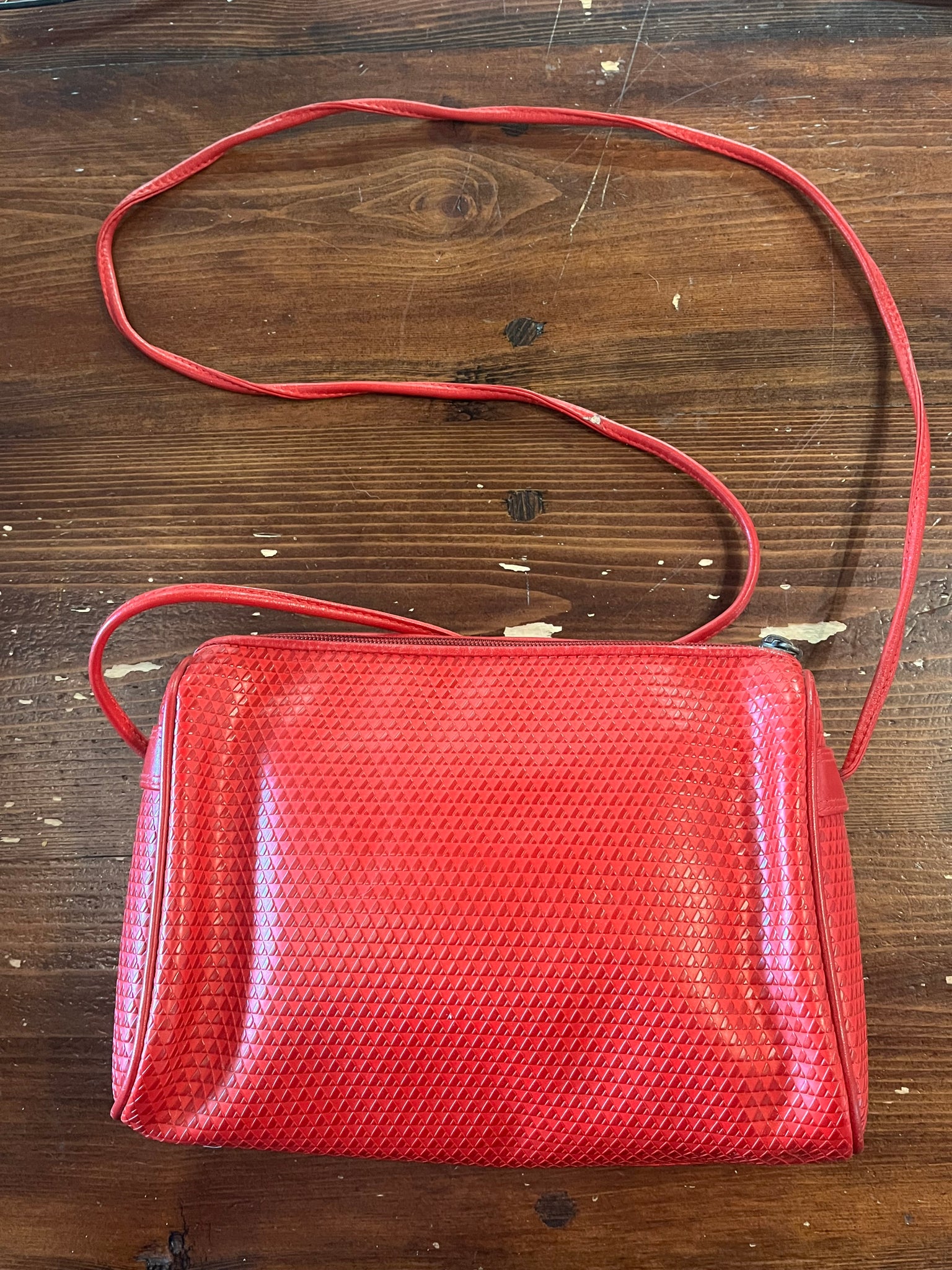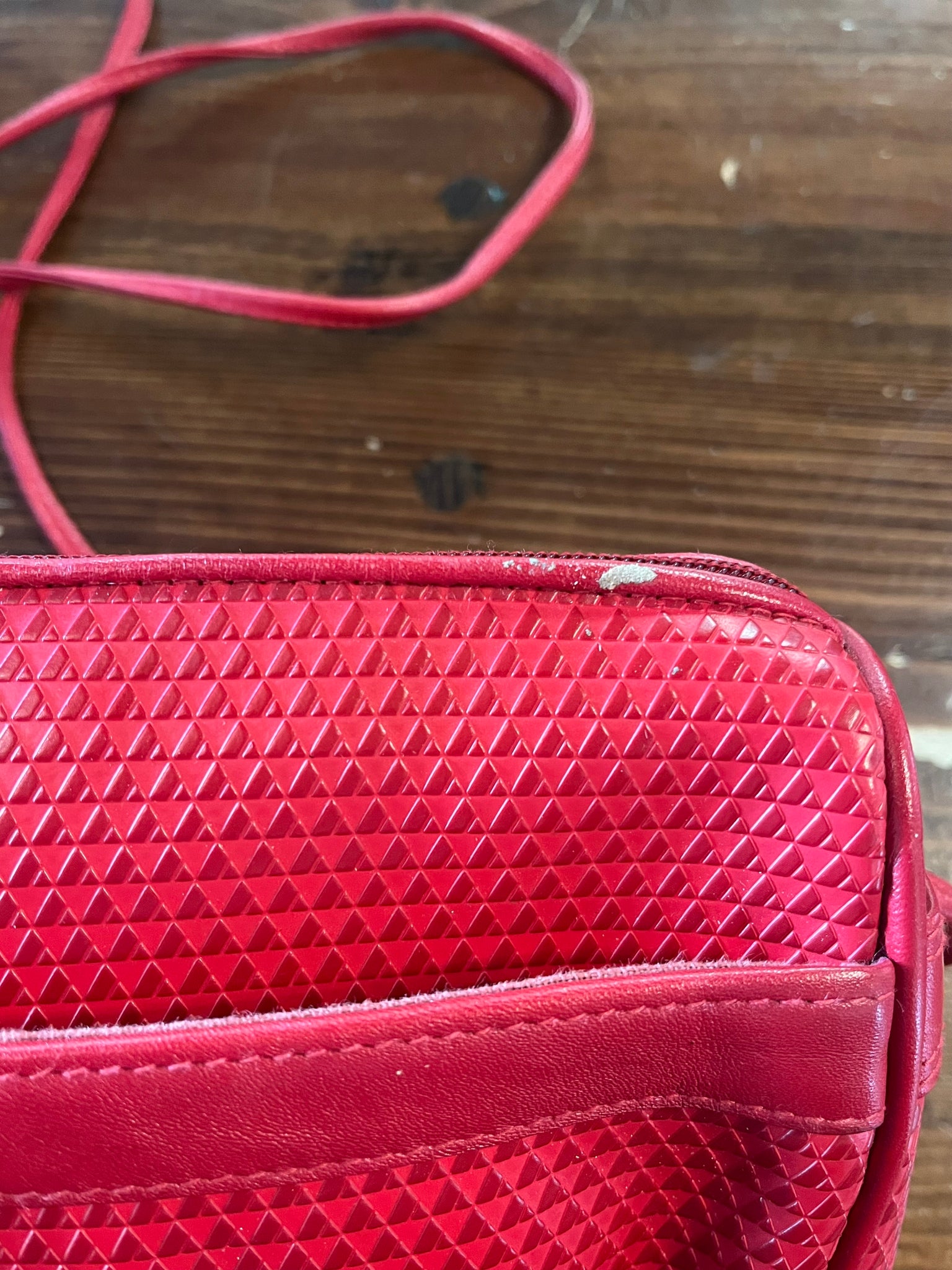 Step back in time with this stunning cherry red Liz Claiborne crossbody from the fabulous '80s. Crafted from supple leather with a chic micro triangle print texture, this vintage gem features a zippered main compartment to keep your essentials secure, plus a handy outside pocket for quick access. The long adjustable leather strap lets you wear it crossbody-style for hands-free convenience. A timeless piece that proves good taste never goes out of style—perfect for adding retro flair to any modern outfit.